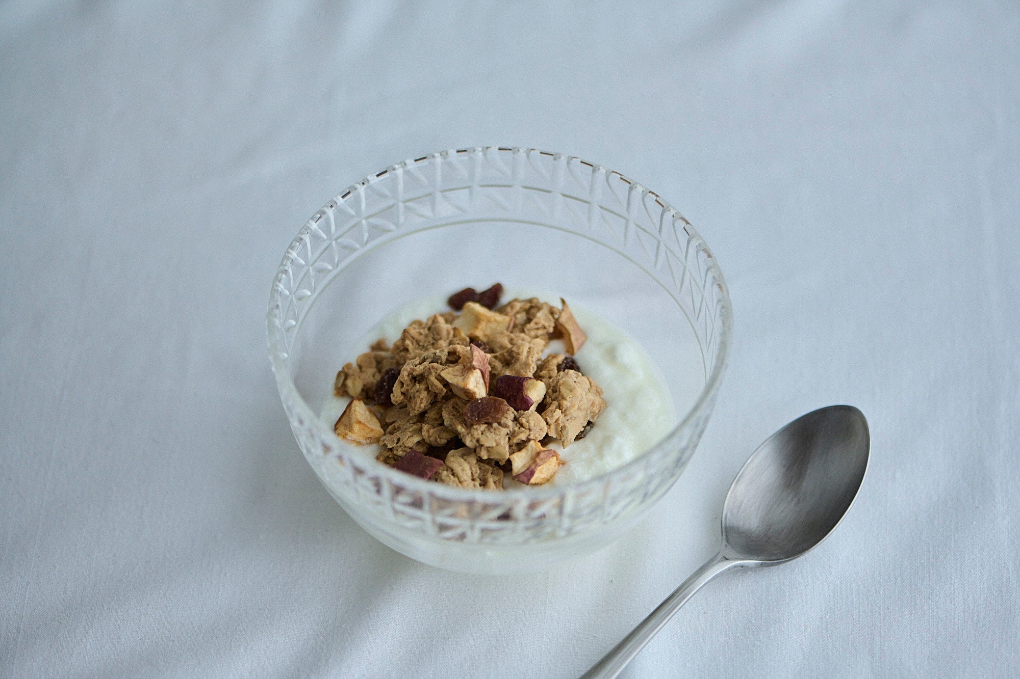 3姉妹の中では、いちばんさわやかで、やさしい味わいのアップルグラノーラ。ヨーグルトに乗せたり、豆乳をかけて。紅茶の風味ともよく合いますし、そのままおやつにつまむのもおすすめ。