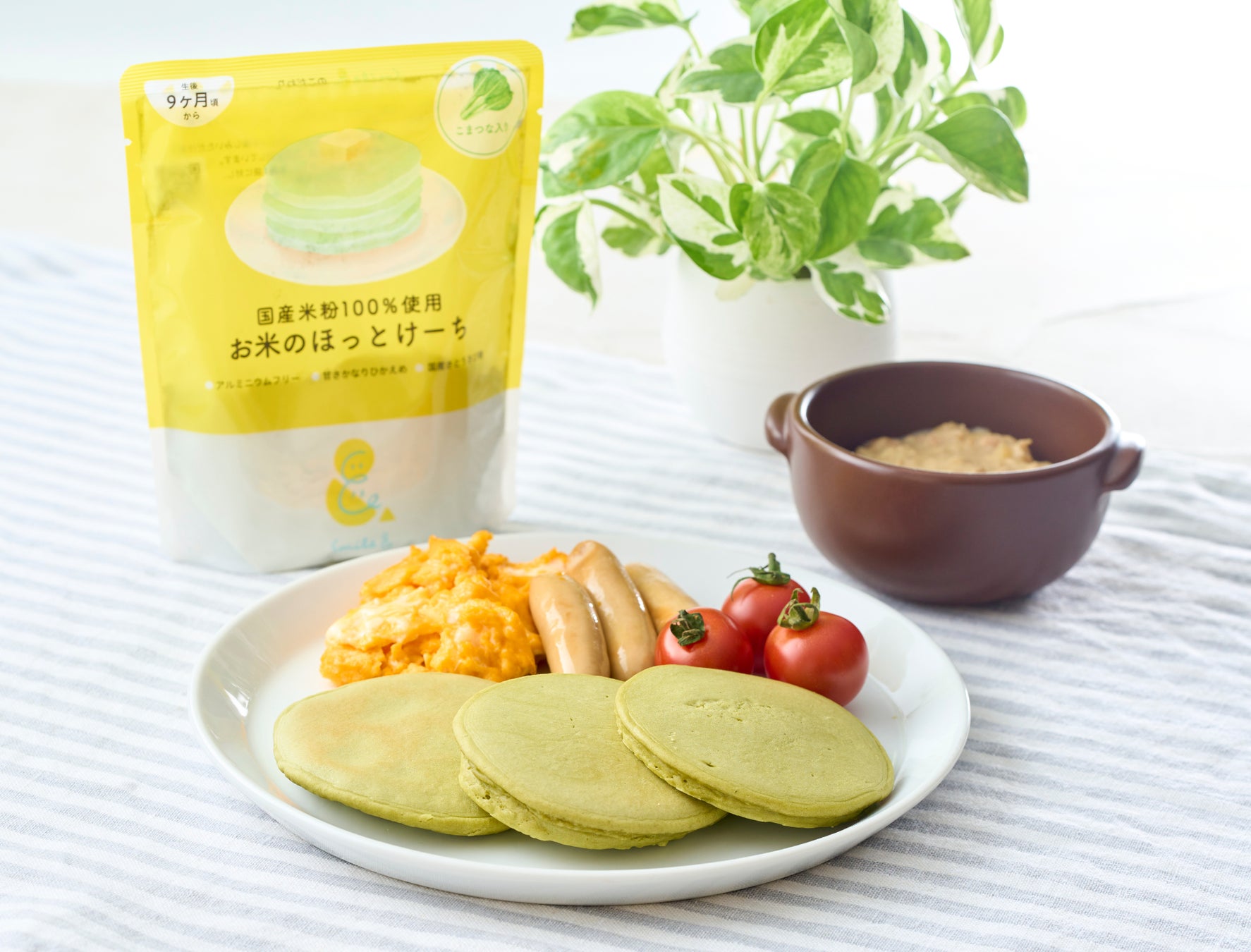 子どもが大好きなホットケーキを食べる際に、少しでも栄養を補えるようにと考え、国産米粉を使った甘さ控えめのホットケーキミックス粉に、緑黄色野菜の代表格である小松菜の粉末を加えました。これにより、お子様がおいしく野菜を摂取できるよう配慮しました。原材料がシンプルなため、ホットケーキだけでなく、焼き菓子などのスイーツや蒸しパンなど、多様にアレンジすることもできます。