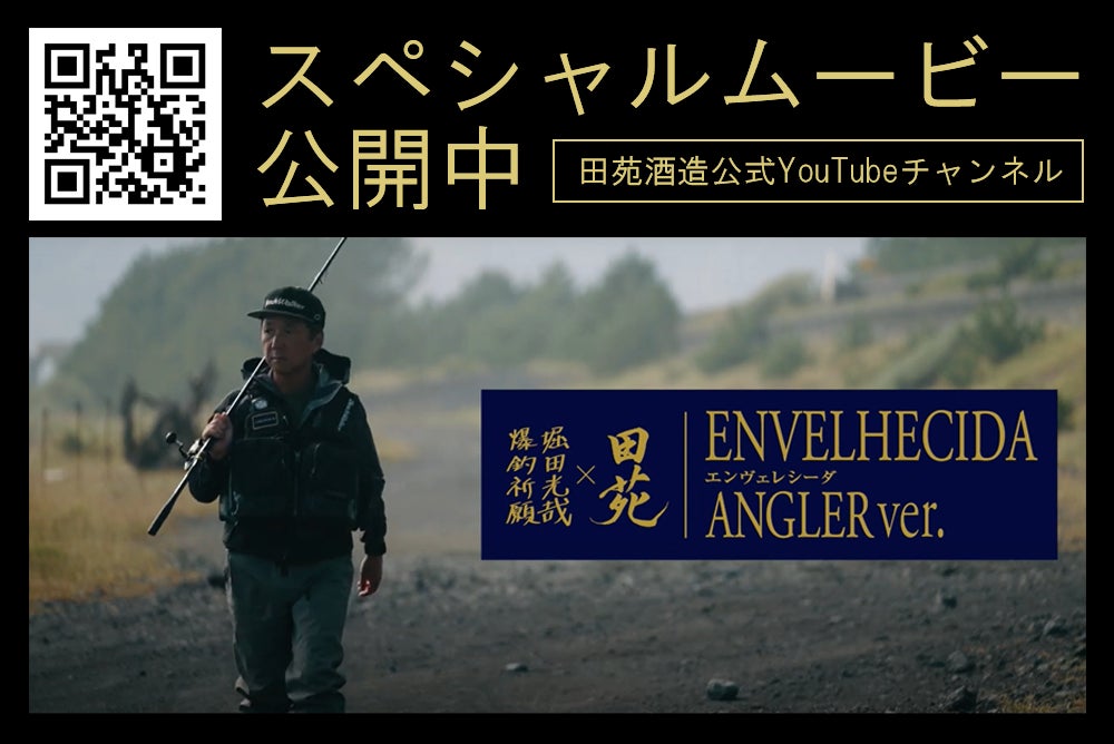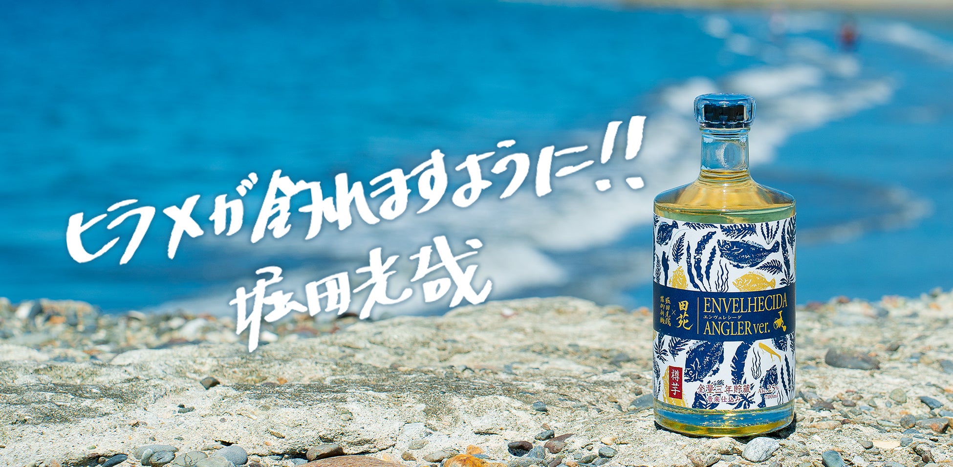 本企画は、同社釣り好き従業員の“釣りと焼酎を一緒に盛り上げたい”という想いに堀田氏に賛同いただいたことからコラボ実現、対象の芋焼酎を堀田氏に実際飲んでもらい、白身魚に相性が良いとお墨付きをいただきました。ラベルデザインは、ANGLER(釣り人)に手に取ってもらいたいという想いを込めて、堀田氏が最も得意とする「ヒラメ」をはじめ、海をイメージした「海藻」をちりばめ、そこに堀田氏直筆の「爆釣祈願」を記して仕上げました。本製品は、2018年に発売した樽貯蔵芋焼酎『田苑 ENVELHECIDA』。発売以降、多くのお客様を虜にし、世界のコンペティションでも数々の賞を受賞しています。