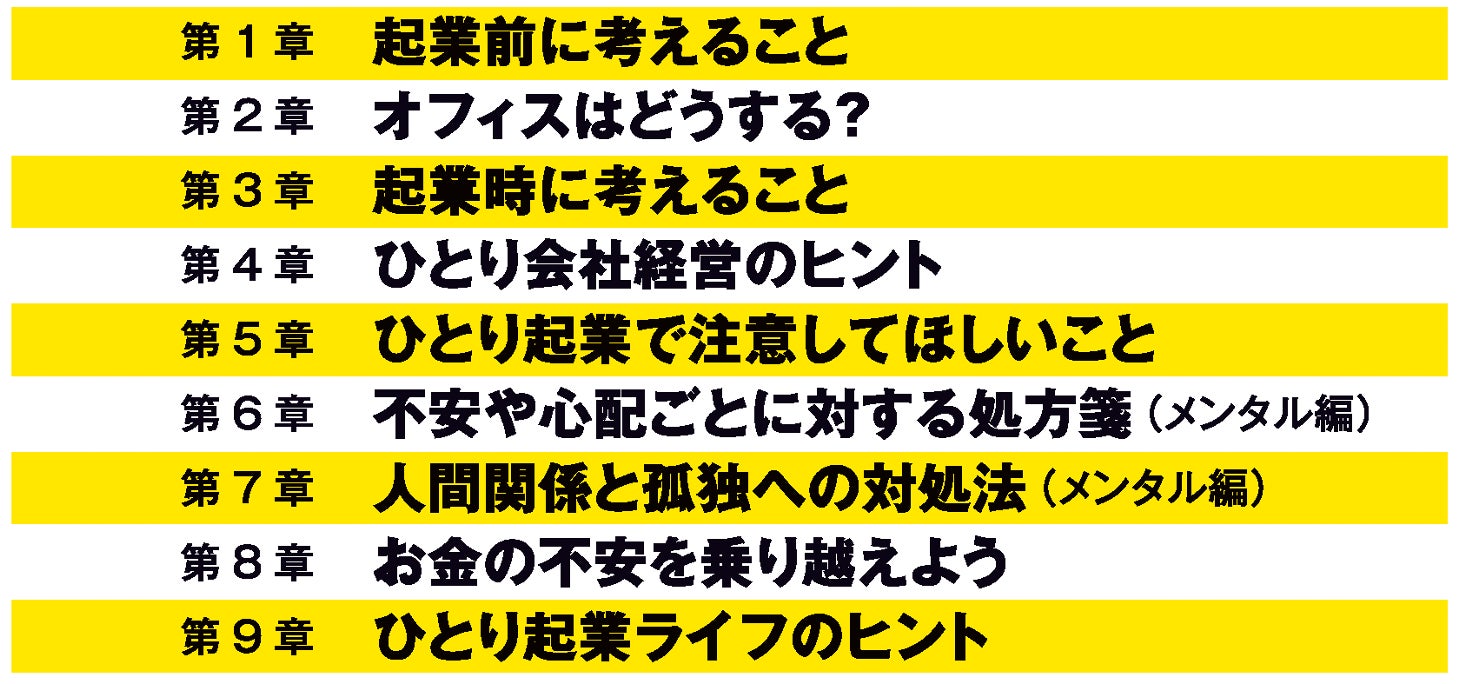 派手なイメージが先行しがちな起業ですが、普通の会社員がたったひとりで独立を果たして、実際にどんな問題が起こるのかといった話題は、実はあまり多くの方に語られてきていません。資本も潤沢ではない「ひとり会社」をどうやって運営していくのか、問題や課題をどう解決していけばよいのか、その試行錯誤を続けていくうちに体験や知見に基づいた「会社運営を続けるコツ」を習得し、大変なことも乗り越え、自分の希望や夢に近づいていくことができます。本書は性別や年齢、専門性やキャリアを問わず、近い将来独立や起業をしたい方、起業で新たなキャリアを築きたい方、起業をしたが課題や悩みが多い方必読の1冊です。