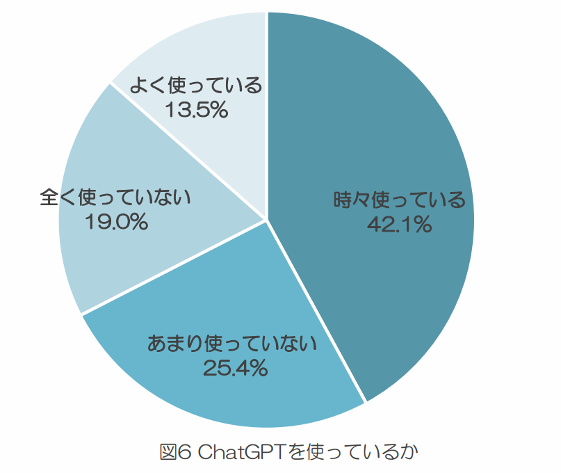 「ChatGPTを利用しているか」について伺うと(図6参照)、「よく使っている」もしくは「時々使っている人」を選択した人の割合が55.6%と過半数の人がChatGPTを利用していることが分かりました。