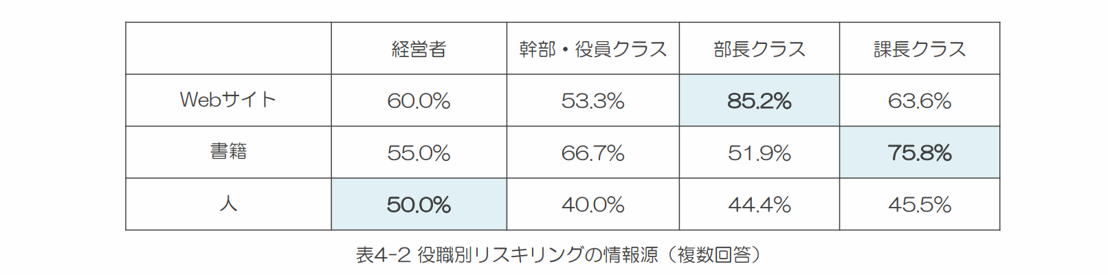 リスキリングの情報源、部長・課長クラスは「Webサイト」「書籍」、経営者は「人」。
