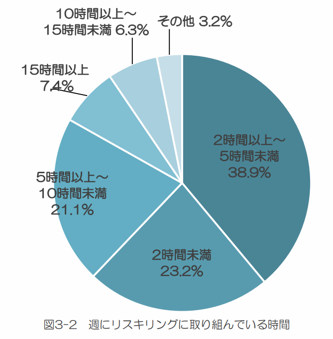 「週にどのくらいの時間リスキリングに取り組んでいるか」について伺うと(図3-2参照)、「2時間以上~5時間未満」が38.9%と最も多く、「2時間未満」が2番目で23.2%、「5時間以上~10時間未満」が3番目で21.1%という結果になりました。6割以上のエグゼクティブが大体週に2時間程度リスキリングに取り組んでいる一方で13.7%のエグゼクティブは週に10時間以上リスキリングに取り組んでいることが明らかになりました。