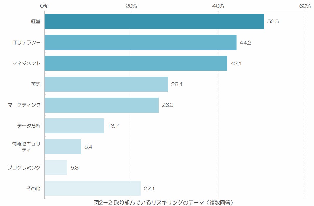 個人としては75.4%がリスキリングに取り組まれていらっしゃり、会社としてなんらかのリスキリングプログラムが導入されているのが34.9%。エグゼクティブ対象で考えれば、会社が与えるよりもやはり自らがテーマ・課題を掲げての研鑽取り組みだと思いますので、健全な比率ではないでしょうかね。