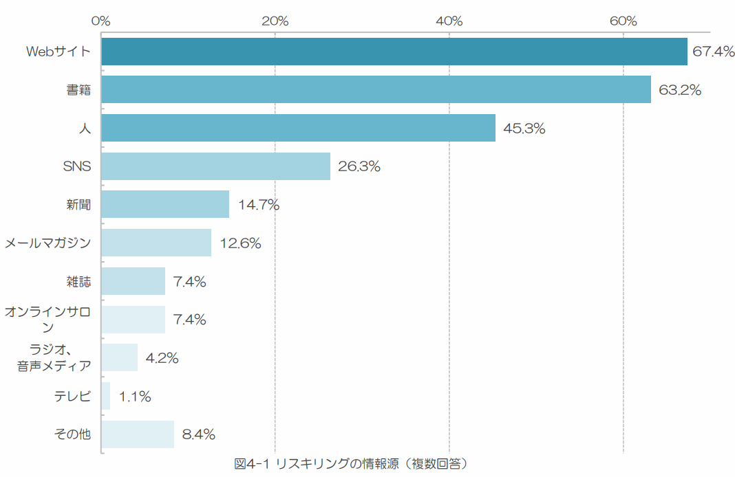 「リスキリングの情報源」について伺うと(図4-1参照)、「Webサイト」が67.4%と最も多く「書籍」が2番目で63.2%、「人」が3番目で45.3%という結果となりました。