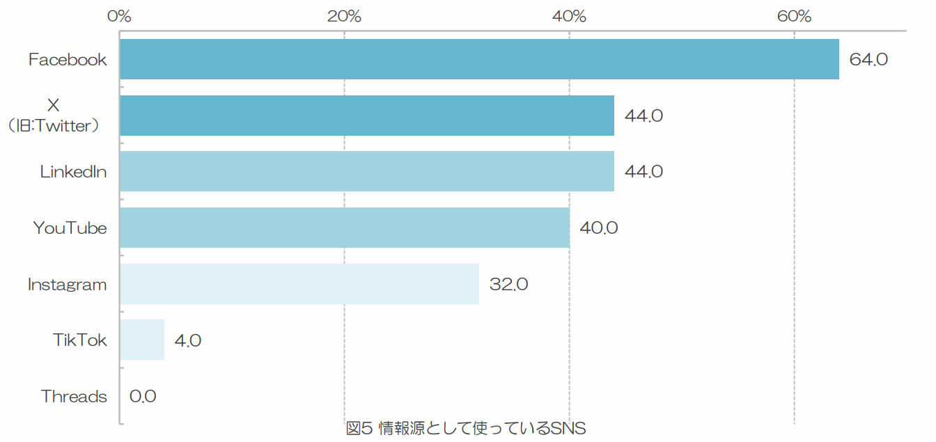 「情報源として使っているSNS」について伺うと(図5-1参照)、「Facebook」が64.0%と最も多く、「X(旧:Twitter)」と「LinkedIn」が2番目で44.0%、「YouTube」が3番目で40.0%という結果になりました。最新の「Threads」を情報源としているエグゼクティブの割合0.0%でした。