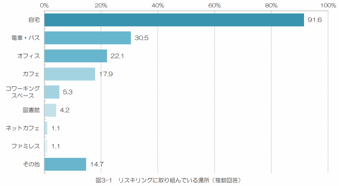 「リスキリングに取り組んでいる場所」について伺うと(図3-1参照)、「自宅」と回答したエグゼクティブが91.6%と圧倒的である一方で、「電車・バス」が30.5%と次に多く、多くのエグゼクティブは移動時間も有効活用していることが分かりました。「オフィス」が22.1%と3番目に多く、会社の勉強会や仕事の空き時間を活用しているとの声もありました。