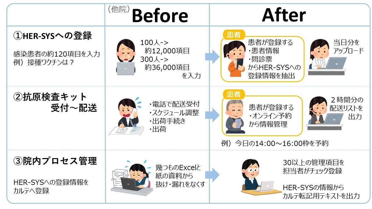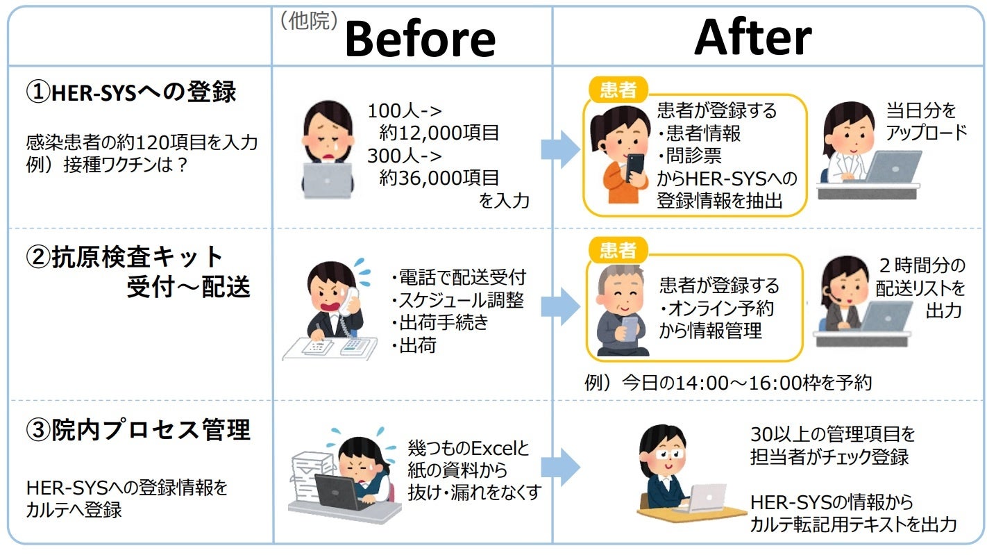患者がスマホから登録した個人情報と問診票から、HER-SYSへの登録、および、抗原検査キットの配送を自動化する。抗原検査キットの配送もネットで予約を受け付け、医療の負担を大幅に軽減する。