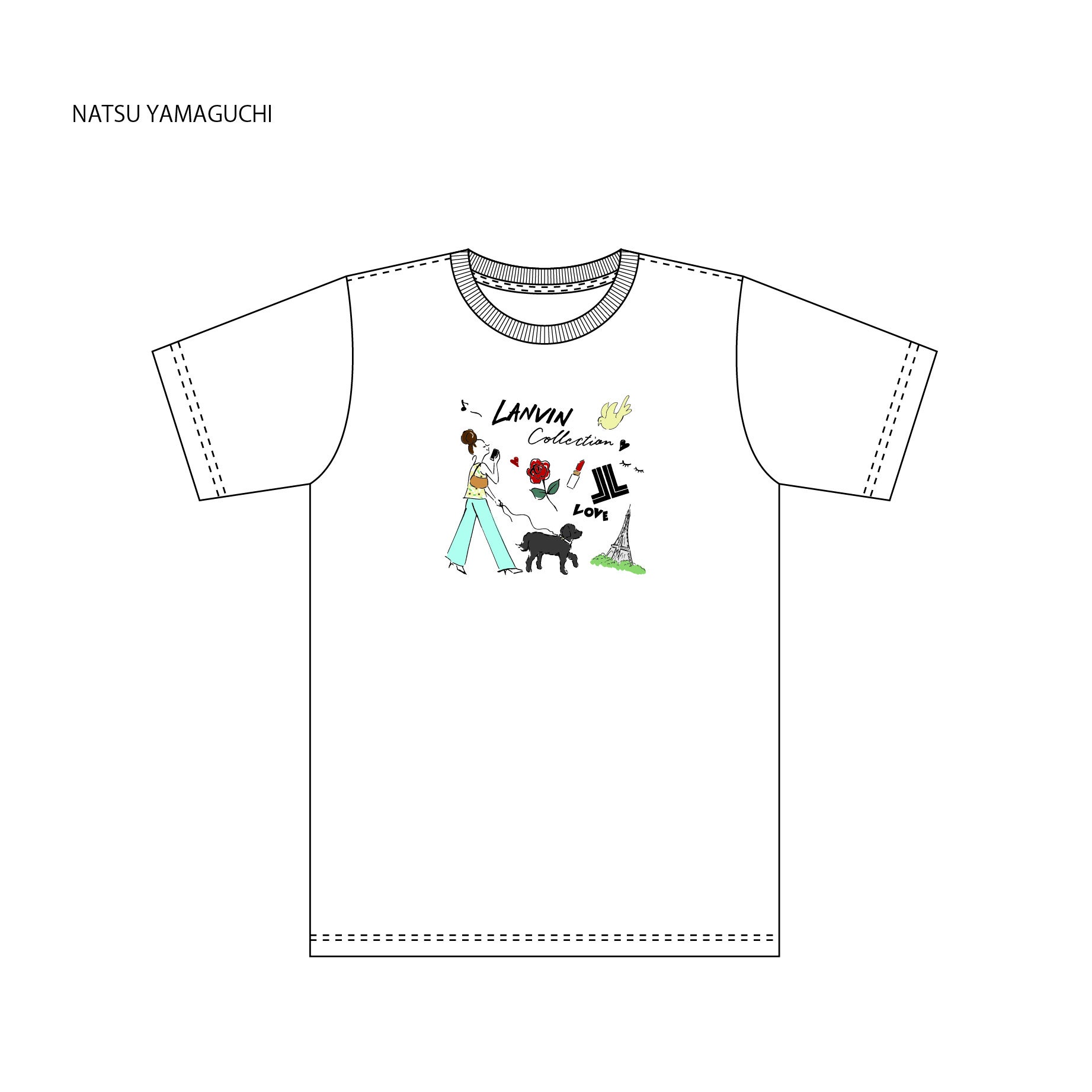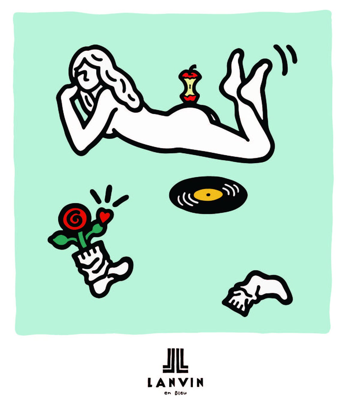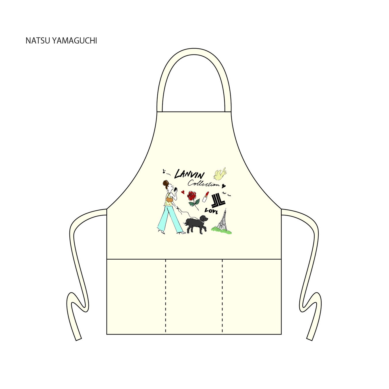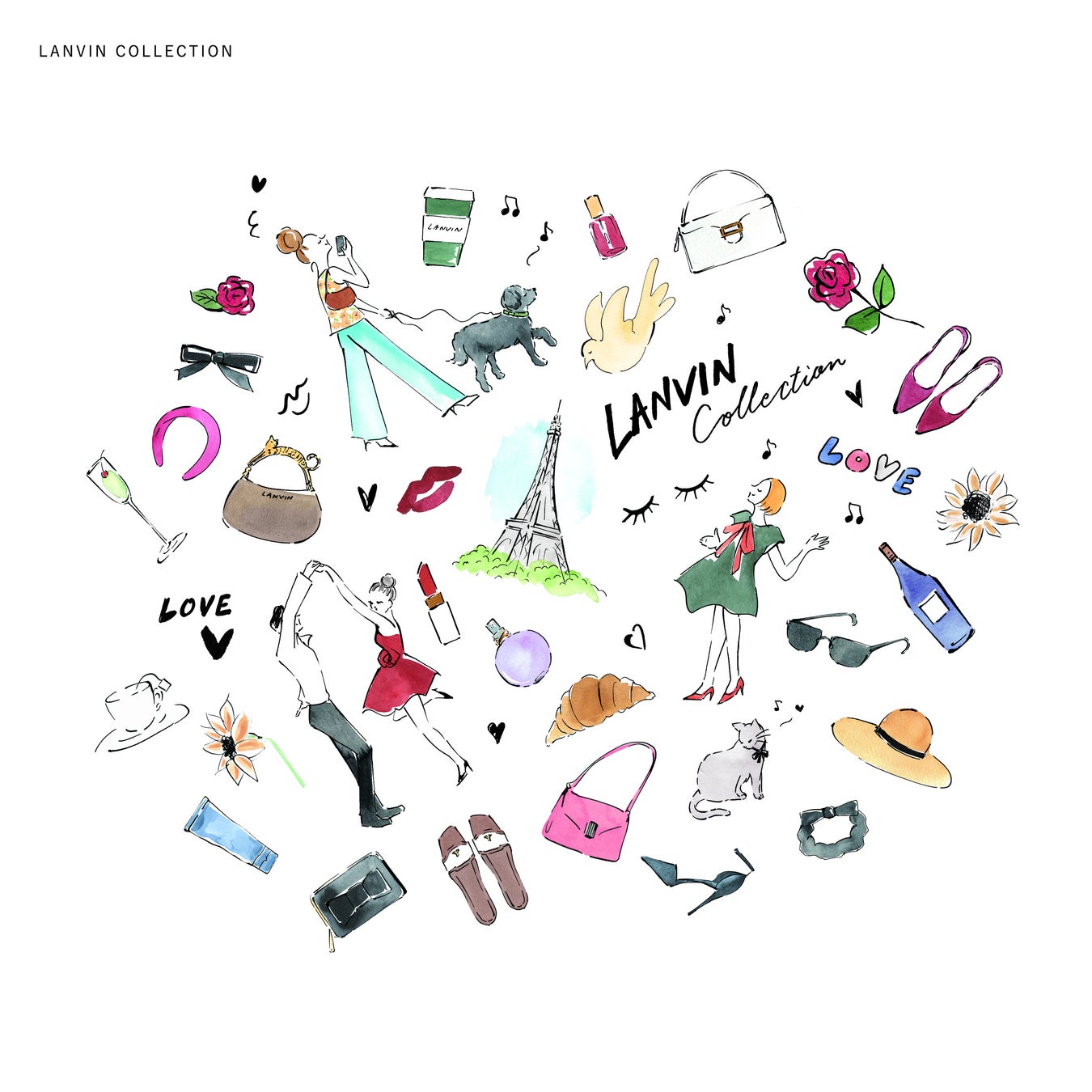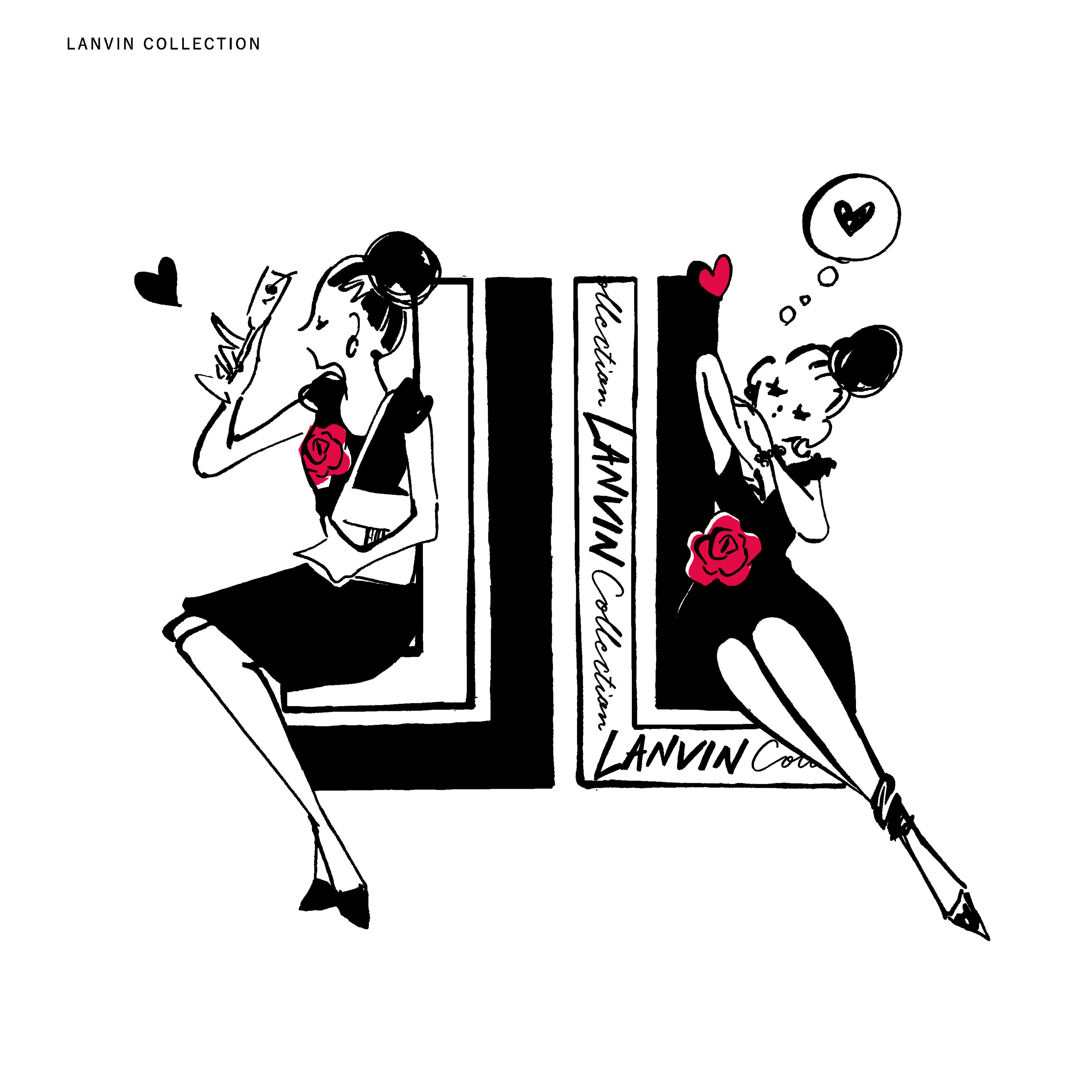 3)ランバン コレクション・ランバン オン ブルーのお洋服と共にある、愛あるシチュエーションをテーマに何気ない⽇常のなかに⾒え隠れする愛しい瞬間を描いてみました。パリのイメージで、靴やバッグ、⼥の⼦モチーフを散りばめています。