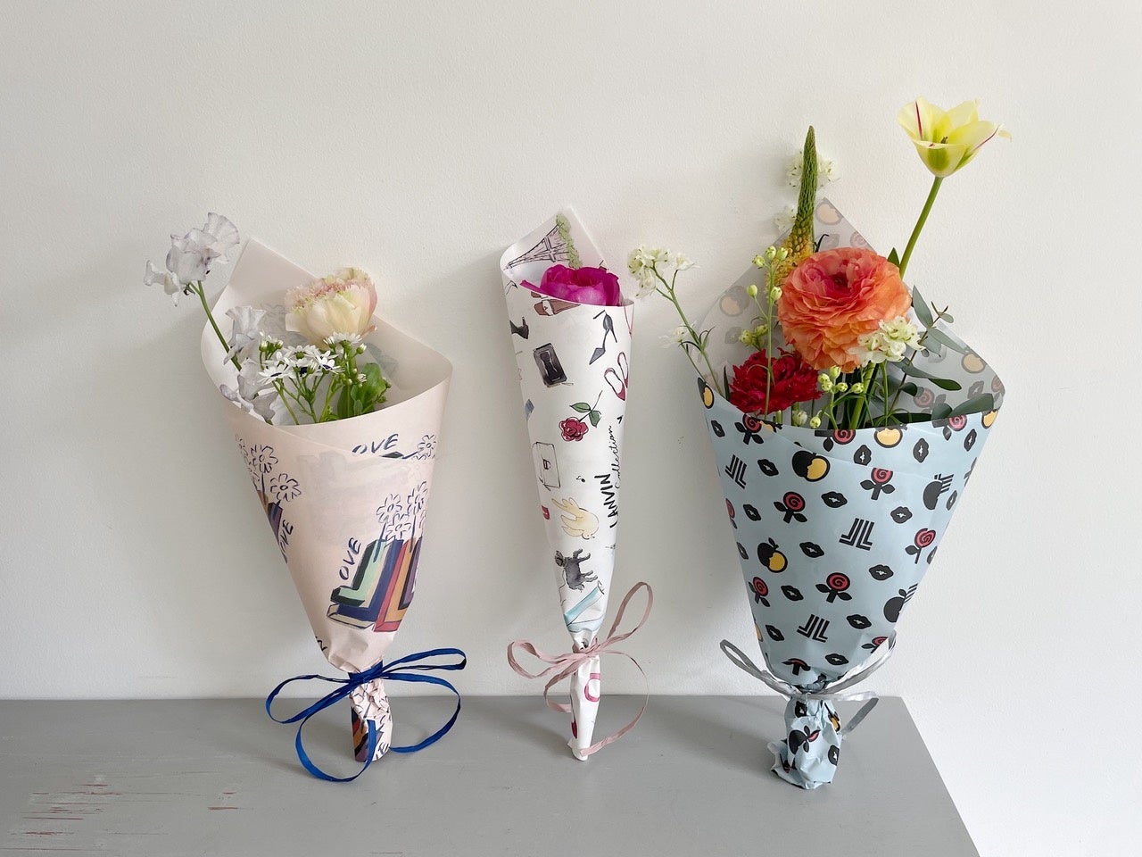 また、3名のアーティストをイメージしたブーケ3種類も販売。購入した方にはメッセージカードに加えて、ステッカーもプレゼント。ここでしか手に入らない、各アーティストのイラストをデザインしたTシャツ、エプロンといったグッズも販売します。