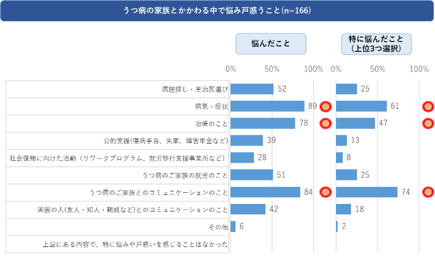 - うつ病患者の家族の困りごととして多く挙げられたのは「患者本人とのコミュニケーション」「病気・病状」「治療のこと」の3点。