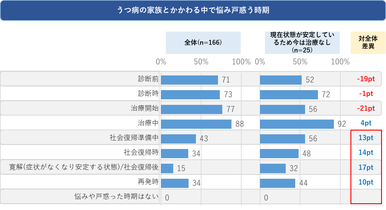 - 現在症状が安定しており、社会復帰を見据えている群であれば治療後の時期の悩みも多い傾向が見られるが、そのような群においても悩みは治療までの間で特に多く見られた。