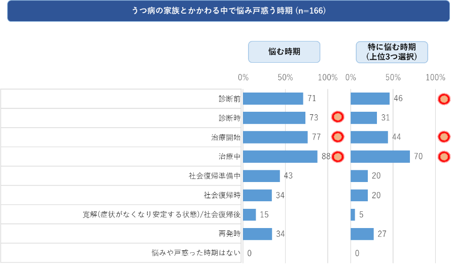 - うつ病患者と関わる中で悩み戸惑う時期としては「治療中」「治療開始」「診断前後」と、治療までの時期に集中している。