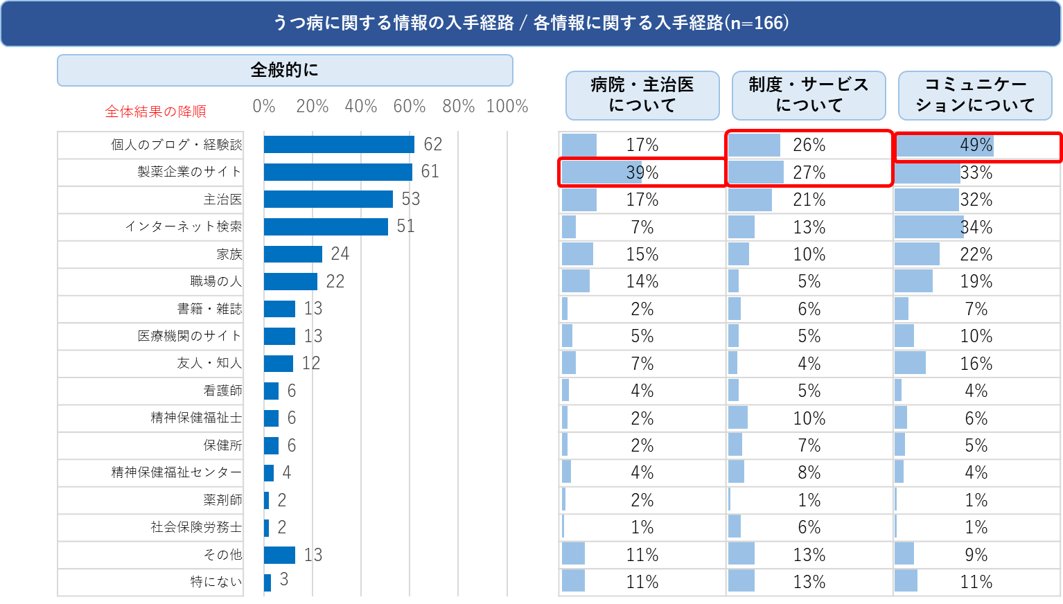 - 病院・主治医については最も手段として利用されているものでも「製薬企業のサイト」が4割弱と、定まった手段ではない様子であった。また制度・サービスについては「個人ブログ」か「製薬企業のサイト」が3割弱、うつ病患者とのコミュニケーションについては「個人ブログ」が5割程度と、個人が発信する情報に頼らざるを得ない状況が浮き彫りとなった。