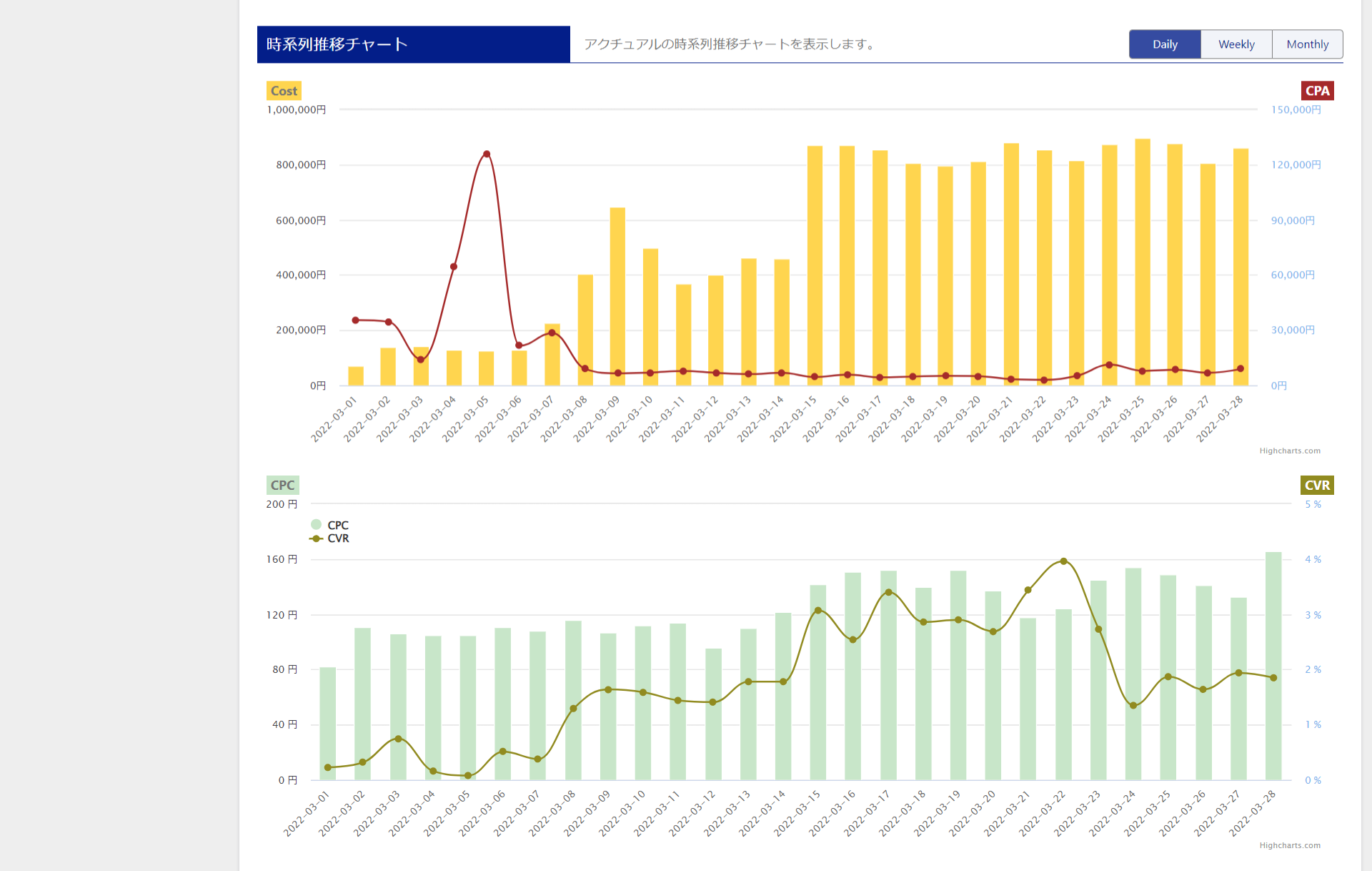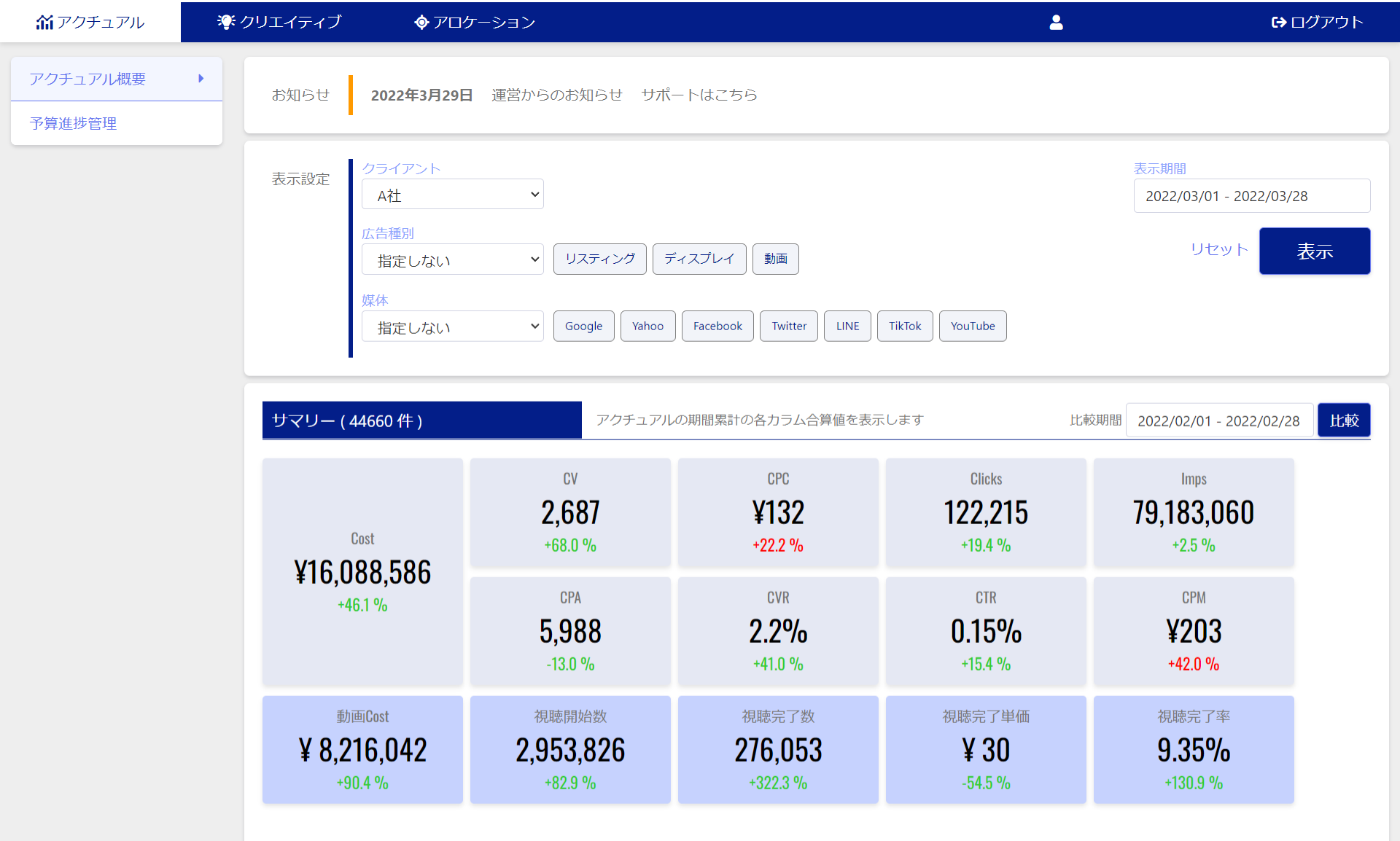 各種広告媒体のAPIを利用した自動データ連携機能を備え、ダッシュボードで一元管理。時系列、媒体別、クリエイティブ別でのアクチュアルパフォーマンスを可視化します。