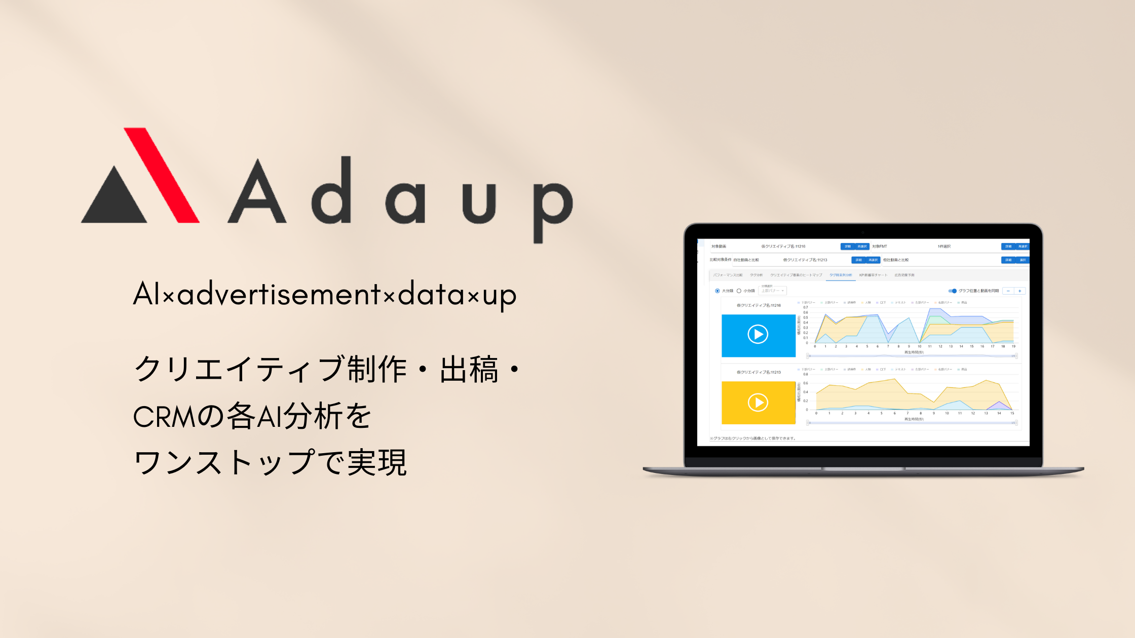 「Adaup」は、AIモデルによる「クリエイティブ・出稿・CRM」の各分析と広告出稿データ(アクチュアル)の管理をワンストップで提供するクラウドサービスです。