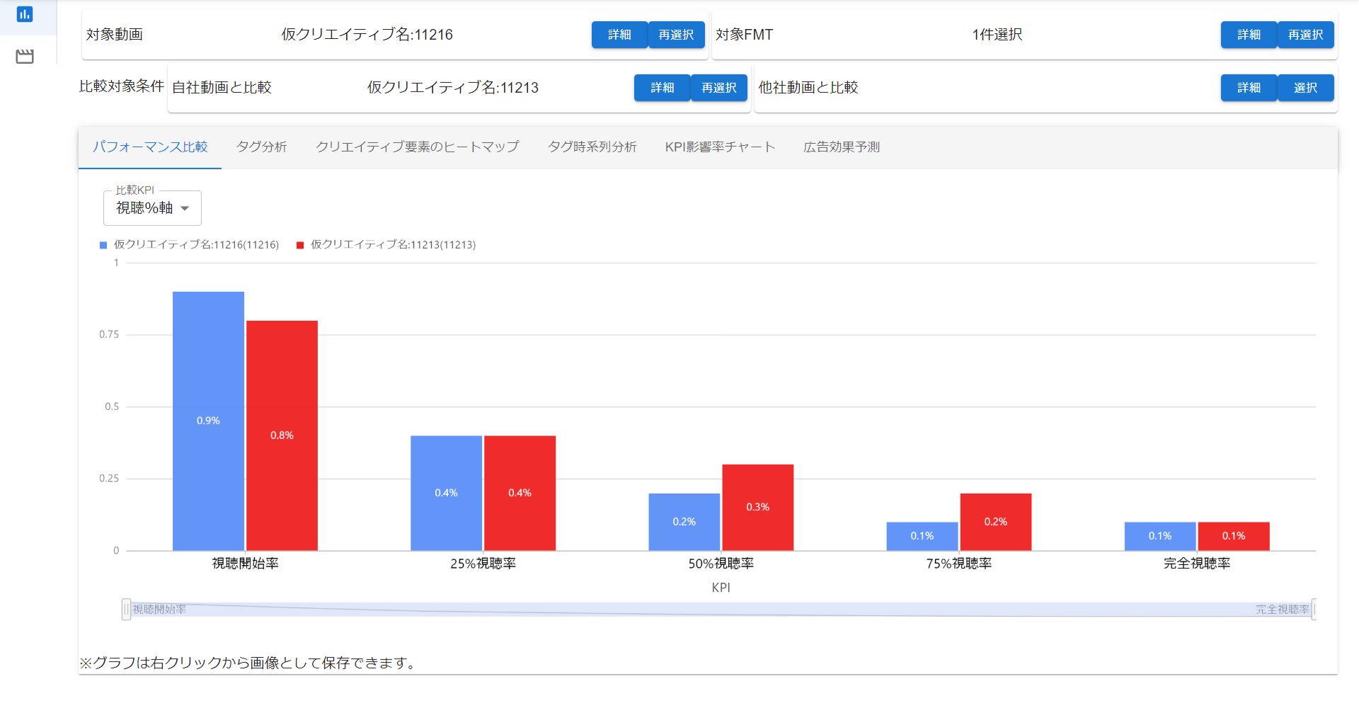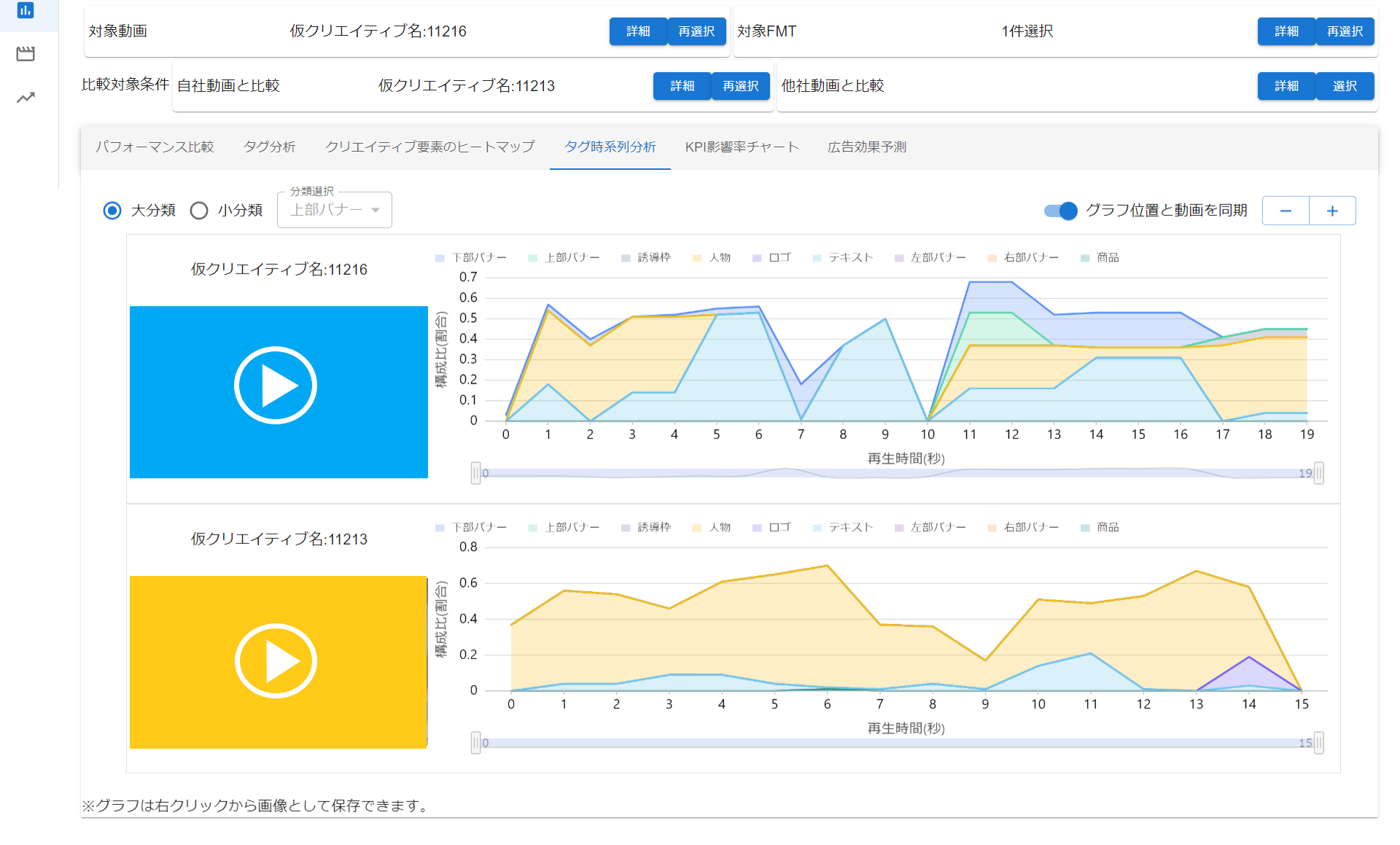 AIが広告動画内の構成要素(人物、ロゴ、商品、テキスト等)を自動検出し定量化。動画を構成要素、KPI、タイムライン(動画尺)、広告効果予測等で分析し、他のクリエイティブとの比較も可能。クリエイティブ改善の示唆とクリエイティブPDCAの効率化を実現します。