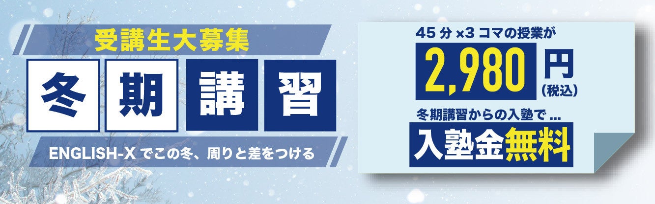 東京大学や早稲田大学・慶應大学の現役合格など多くの実績をもつENGLISH-Xの授業を冬期講習(2022年12月20日〜2023年1月14日)の期間、全3回2,980円(税込)でご提供いたします。