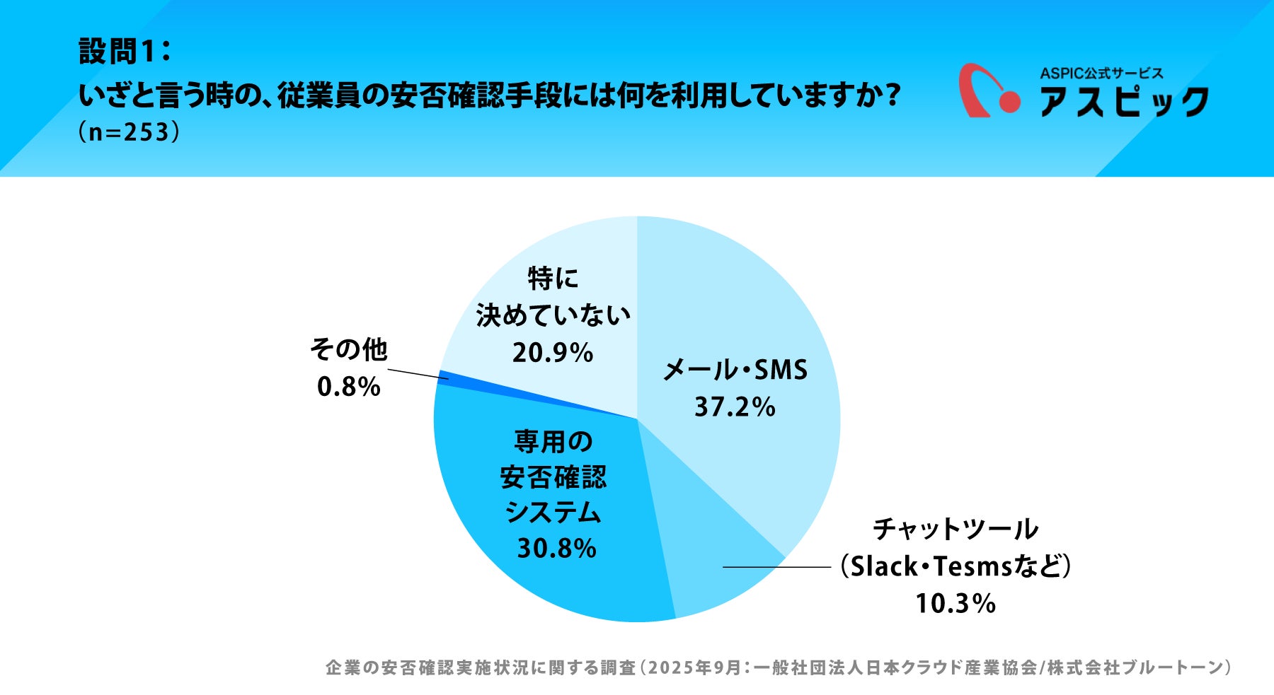 8割以上の企業が何らかの安否確認手段を用意。「専用の安否確認システム」も3割。