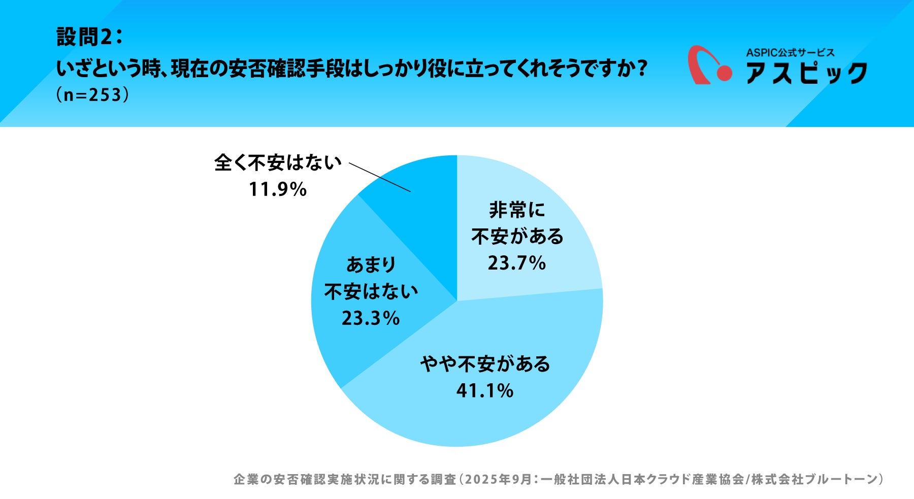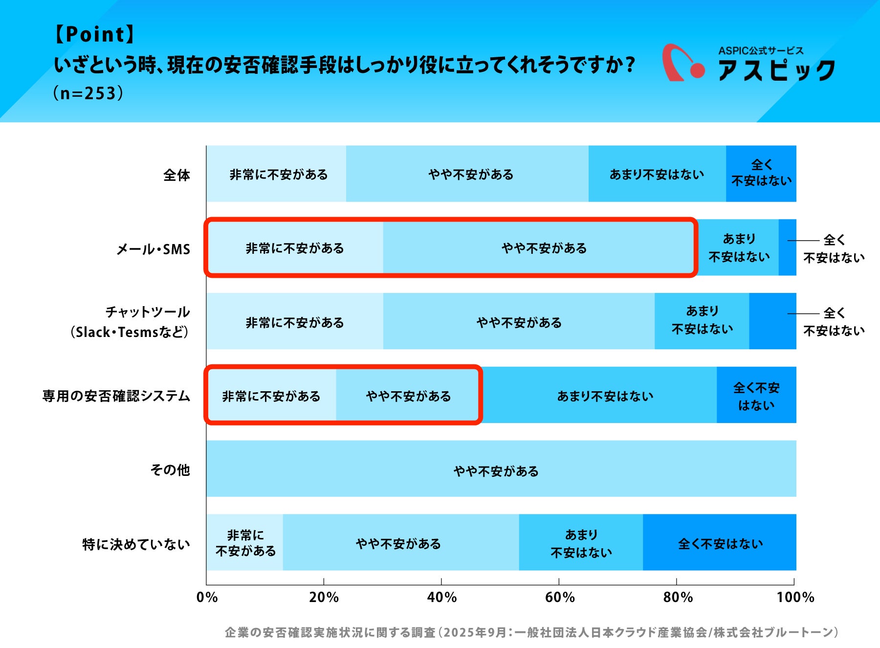 多くは「メール・SMS」「チャットツール」にとどまっているが、そのうち6割以上はいざという時に上手く機能するかどうか「非常に不安がある」「やや不安がある」と回答している。