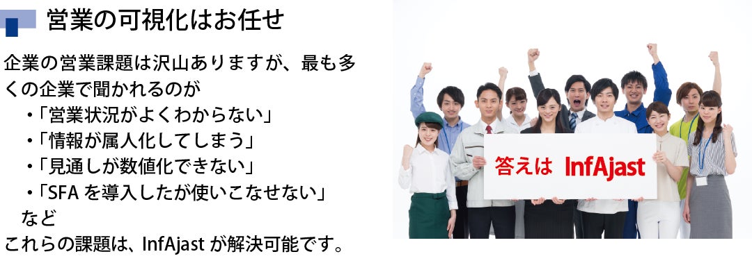 「InfAjast インフアジャスト」は、法人向けIT製品比較サイト「ITトレンド」(運営会社:株式会社Innovation)のSFA部門年間ランキングにて2020年より4年連続 第1位を獲得しているグループウェア一体型の営業支援システムです。「共有」「蓄積」「活用」をコンセプトに顧客管理を軸として各機能が連携することで、営業活動の属人化など様々な営業課題の解決をサポートいたします。