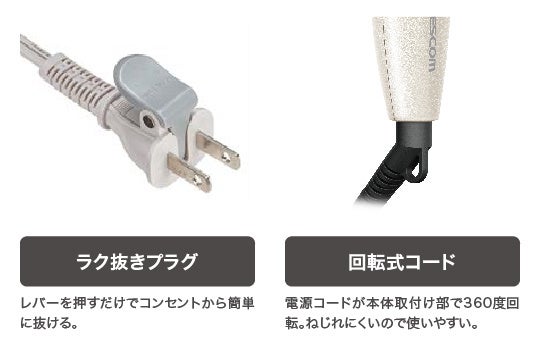 電源コードが本体取り付け部で360度回転し、ねじれにくいです。