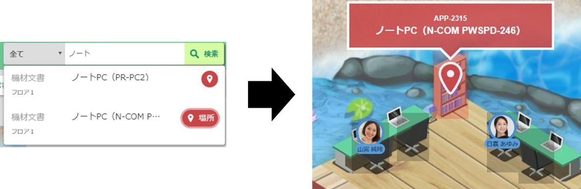 リモートワークで業務が滞りがちな会議室などのオフィス設備、備品の利用状況確認、予約のほか、社則などのマニュアル・契約書・帳簿といった文書の一括管理が可能です。また、これらのすべてを網羅的に検索でき、ビジュアルイメージとともに表示します。