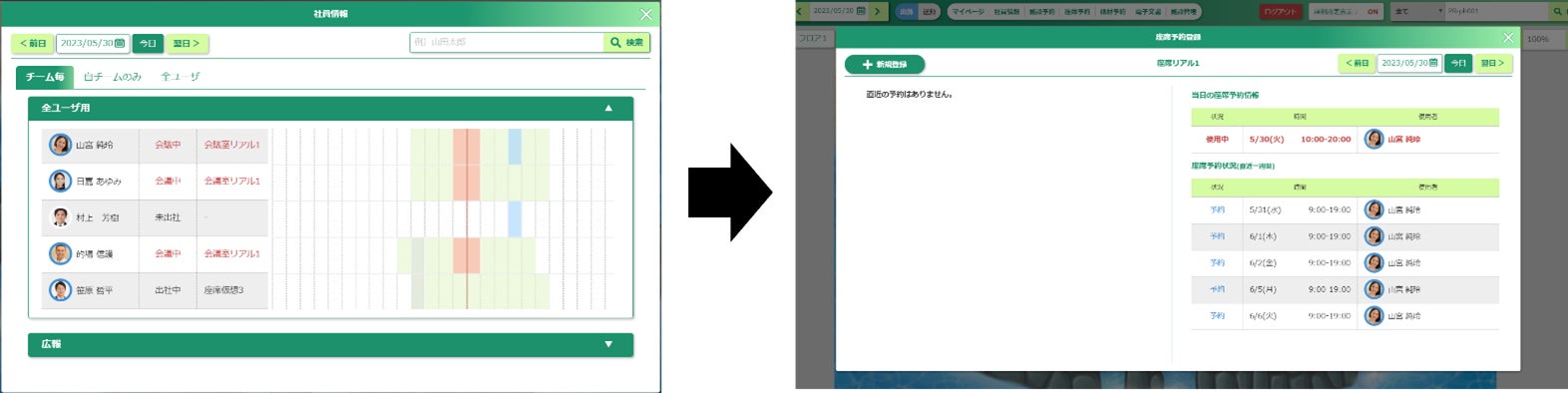 ▲リアルワーク・リモートワーク問わず社員が相互に勤務状況を確認でき、その情報を元にオンライン上での伝言メモやボイスチャット、Web会議を実施可能。