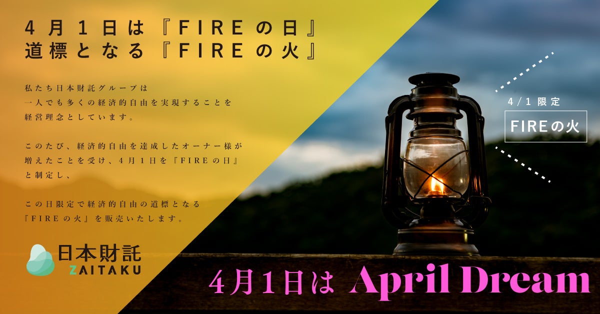 私たち日本財託グループは、一人でも多くの経済的自由を実現することを経営理念としています。このたび、経済的自由を達成したオーナー様が増えたことを受け、4月1日を『FIREの日』と制定し、この日限定で経済的自由の道標となる『FIREの火』を販売いたします。