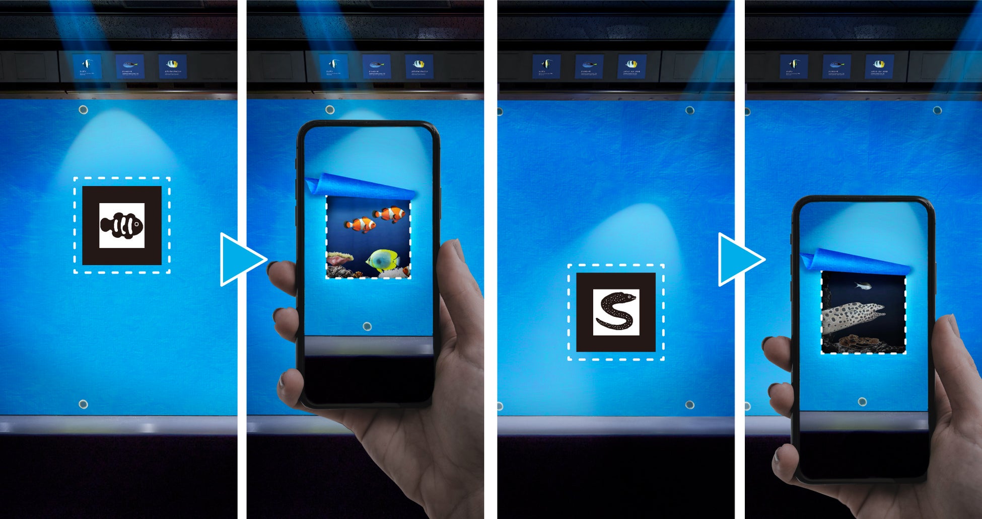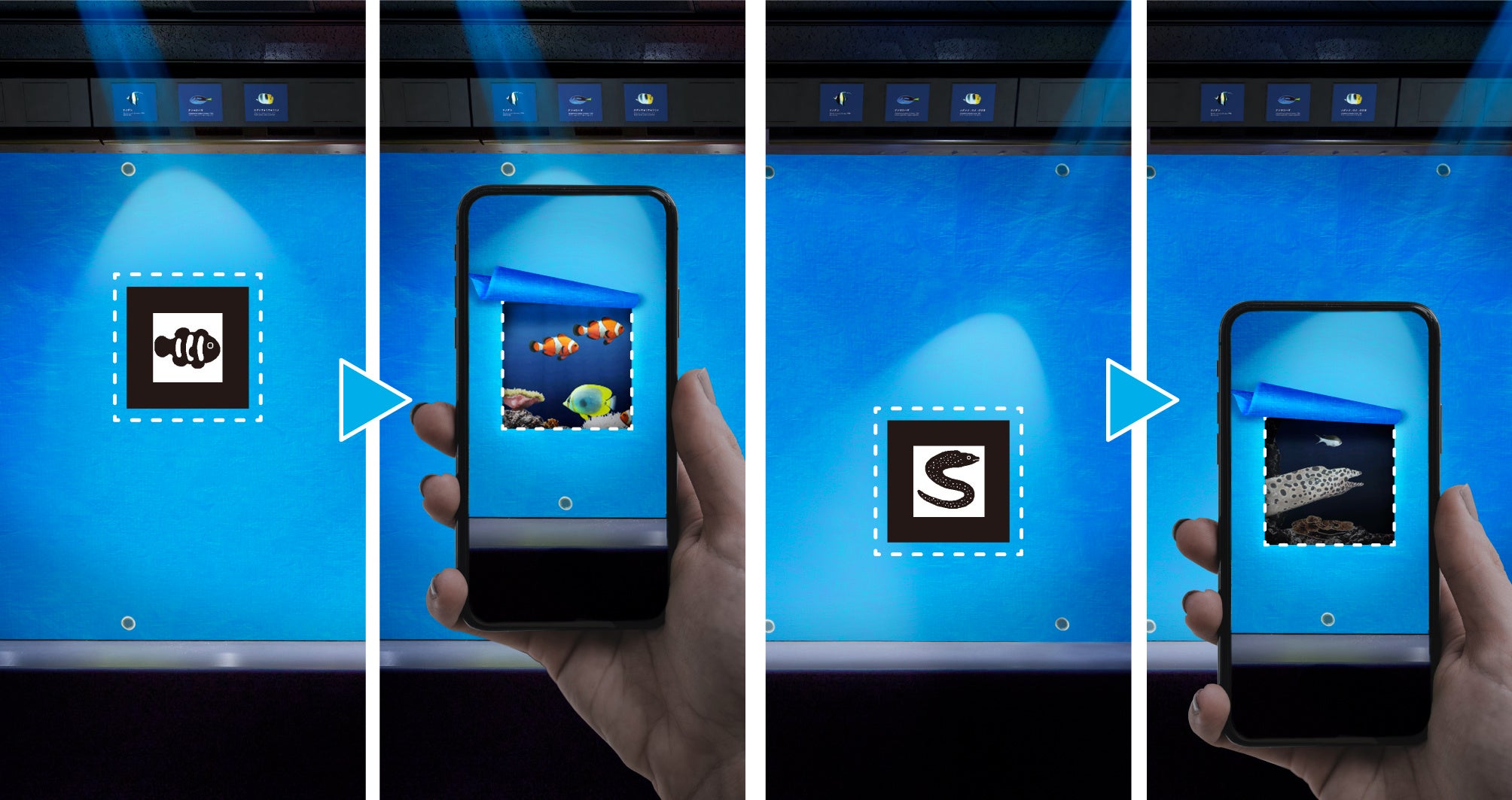 海遊館の特別企画『スマホをかざすと中がのぞける!?「BLUESEAT」』では、2024年9月オープン予定に向けてリニューアル工事中の「グレート・バリア・リーフ」水槽の工事中壁面を覆うブルーシートに描かれた生き物のイラストのついたARマーカーにスマートフォンをかざすと、画面上でブルーシートがめくれて、世界最大級のサンゴ礁「グレートバリアリーフ」で暮らす色とりどりの熱帯魚やアオウミガメ、ウツボなど約10種類が泳ぎ回る、工事中ならではのバーチャル体験を楽しむことができます。