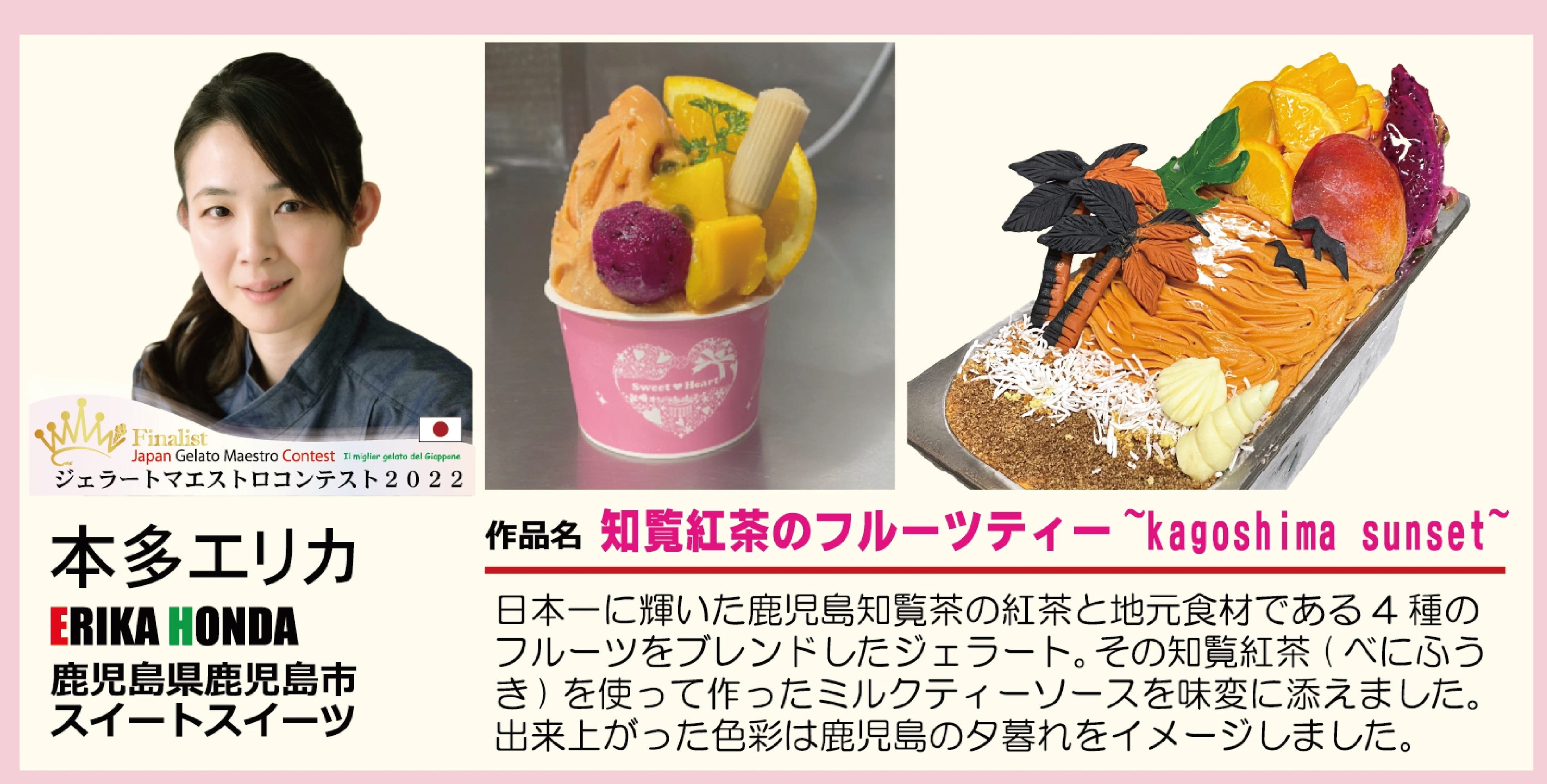 優勝商品の「知覧紅茶のフルーツティー~kagoshima sunset~」は、日本一に輝いた鹿児島知覧紅茶と、地元で獲れる4種のフルーツをブレンド。知覧紅茶・べにふうきを使ったミルクティーソースを添え、味の変化を楽しむことができる鹿児島のおいしさを一杯に詰め込んだジェラートで、出来上がりの色彩も鹿児島の夕暮れをイメージし、審査員の高評価に加え、一般投票でもトップを獲得しました。