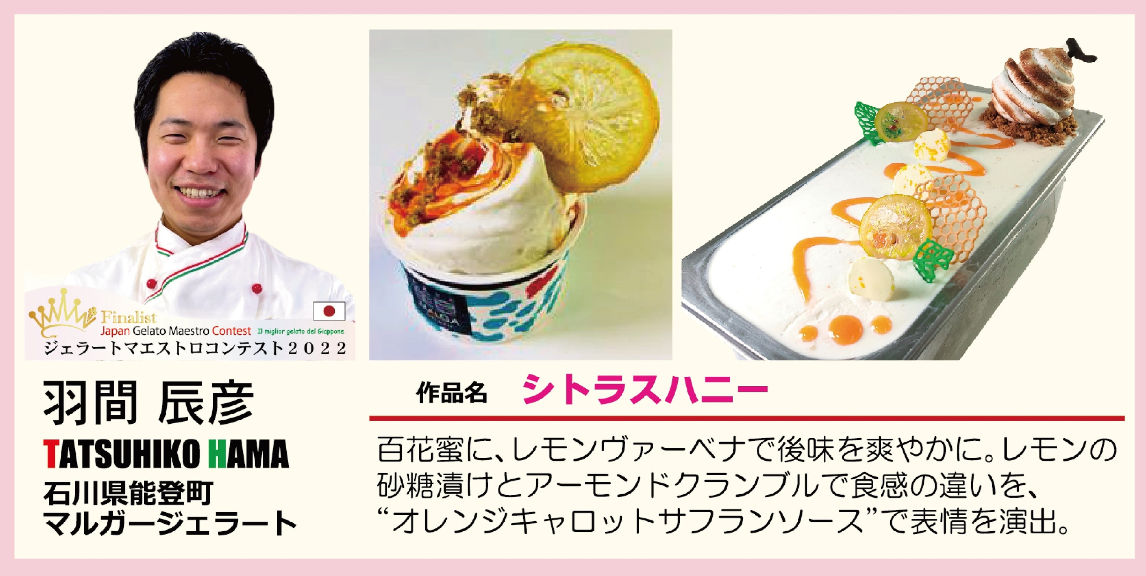 審査の結果、優勝には本多エリカさん(鹿児島県鹿児島市・スイートスイーツ)、第2位に羽間辰彦さん(石川県能登町・マルガージェラート)、第3位は鍋島ひとみさん(石川県羽咋市・道の駅のと千里浜)を選出。また一般投票で最も支持を集めた一般投票最優秀賞は優勝の本多エリカさんがW受賞、高い将来性で今後を期待する審査員特別賞には岩内拓さん(東京都中央区・マリオジェラテリア)が選ばれました。