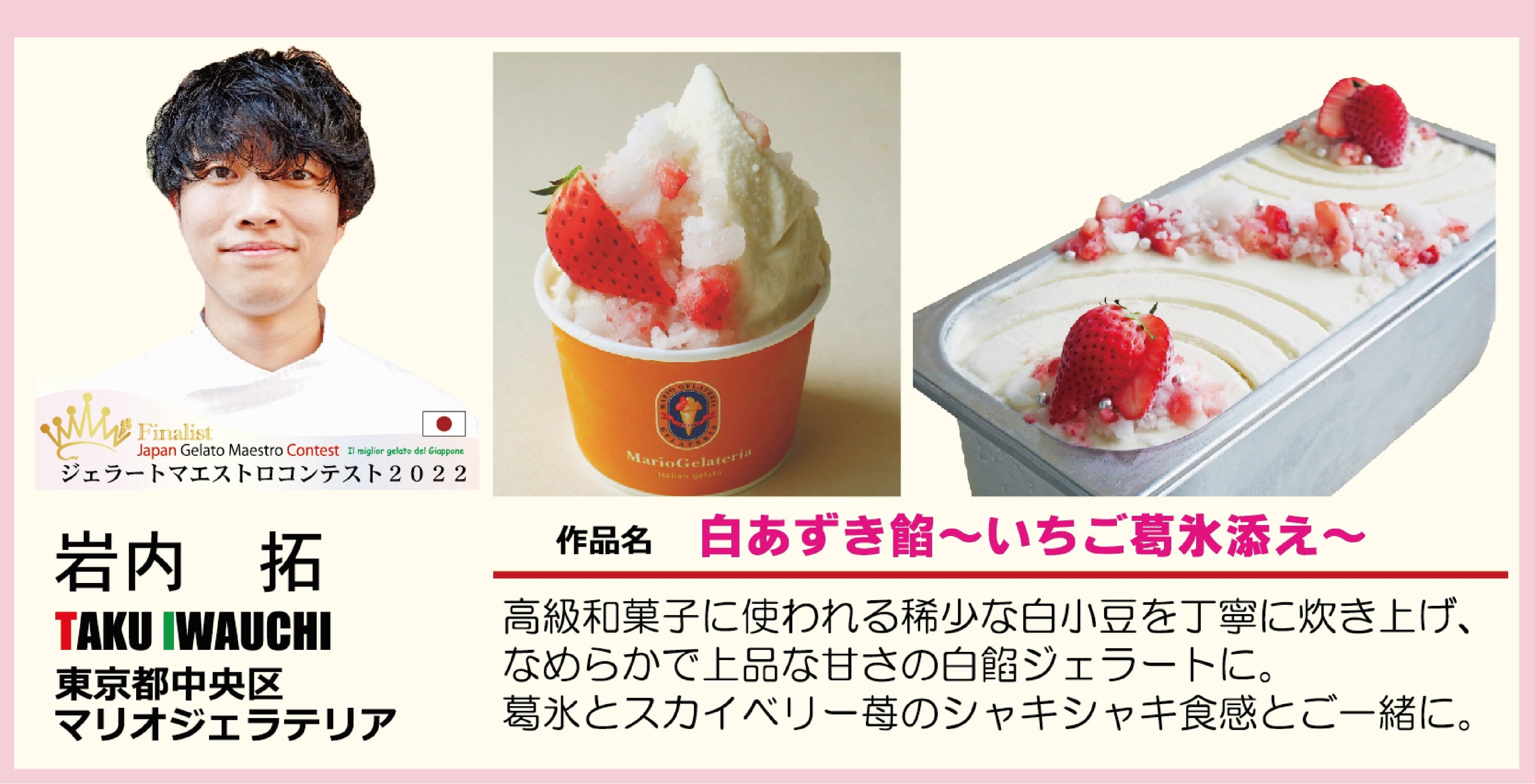 審査員特別賞には岩内 拓さんの「白あずき餡~いちご葛氷添え~」が入賞。和菓子職人の経歴を持つ岩内さんならではのアイディアで、希少な白い小豆を丁寧に炊き上げた、優しい甘さのあずきジェラートに。トッピングされたスカイベリー苺のシャキシャキとした食感も楽しめる逸品となりました。