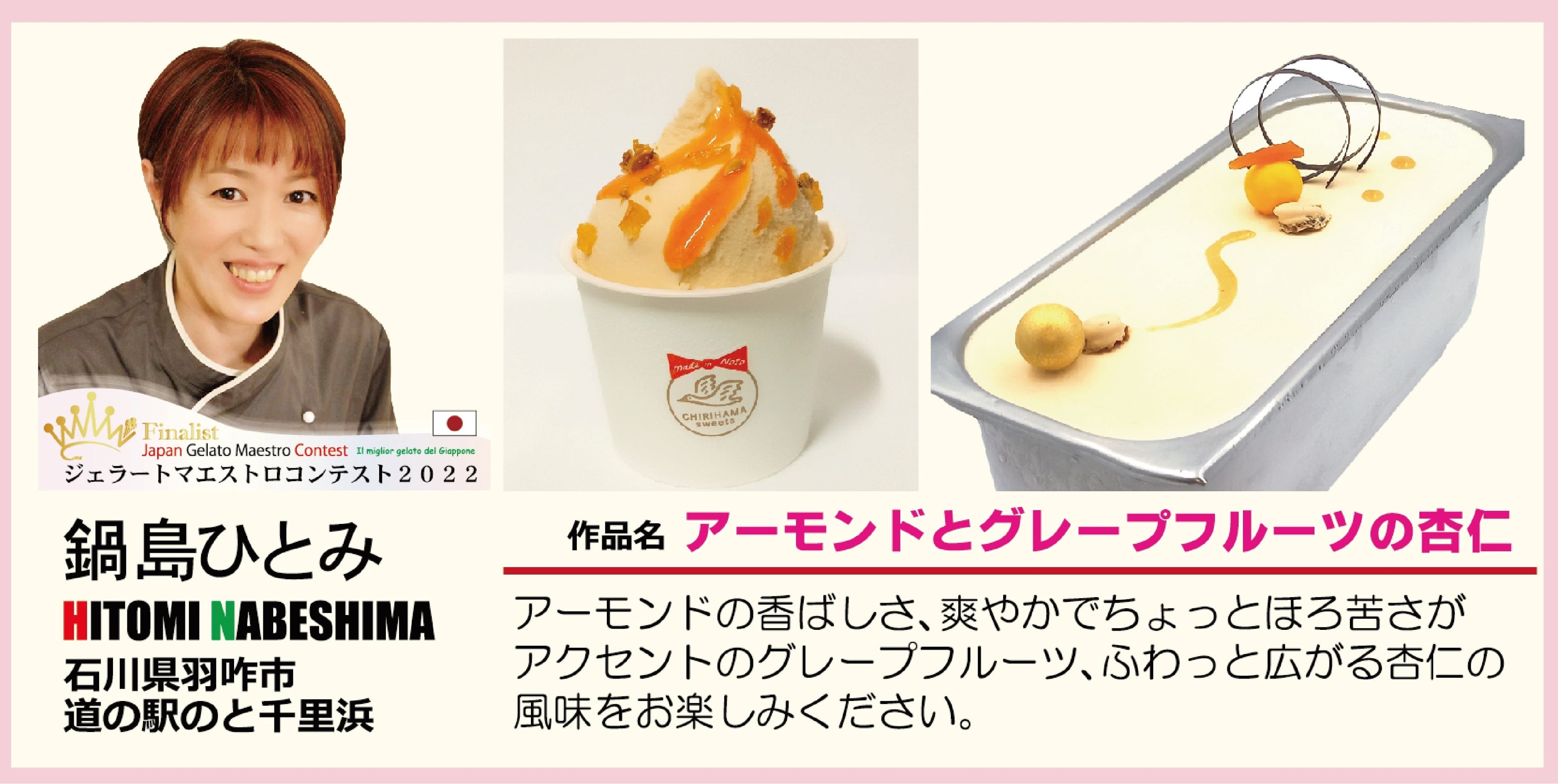 3位は鍋島ひとみさんの「アーモンドとグレープフルーツの杏仁」。アーモンドの滑らかなコクの後味に、ふわっと香る杏仁、さらにグレープフルーツのほろ苦さが加わり、とても香り豊かなジェラートに仕上げました。鍋島さんはコンテスト初チャレンジでの快挙となりました。