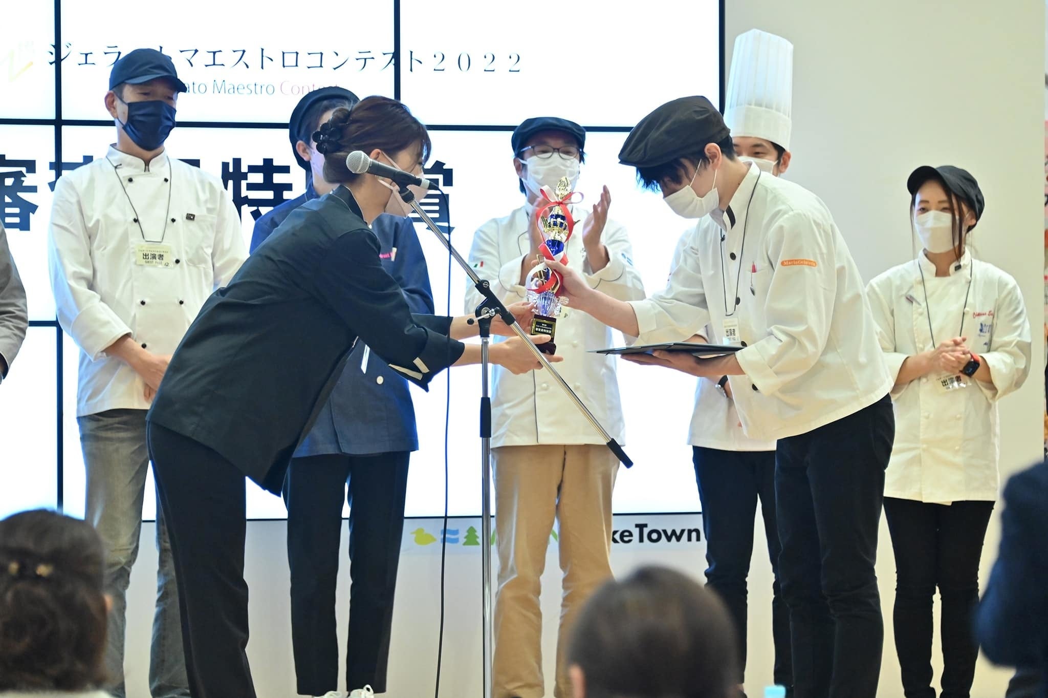 「第5回ジェラートマエストロコンテスト」は、同協会が認定するジェラートマエストロの中から予選を通過した10名を選出し、マエストロの技術・センス・ジェラートに対する思いを競い、2022年度ナンバー1のマエストロを決める大会で、今回は「コロナ禍で食べていただきたい癒しのジェラート」をテーマに、「味、素材の活かし方、オリジナル性、プレゼンテーション、ビジュアル」の5項目を、5段階で評価。