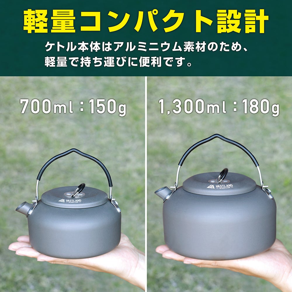 VASTLAND株式会社(本社:兵庫県姫路市/代表:田中悠貴)は、チタンやステンレス素材に比べ熱伝導率が高いアルミニウム素材を採用し、本体表面の硬質アルマイト加工により焦げつきにくく耐食性に優れた「キャンプケトル(700ml / 1300ml)」を2022年5月21日(土)にAmazon店で先行発売することを決定しました。またキャンプケトルの発売を記念して、Amazon店限定で「発売キャンペーン」を開催します。