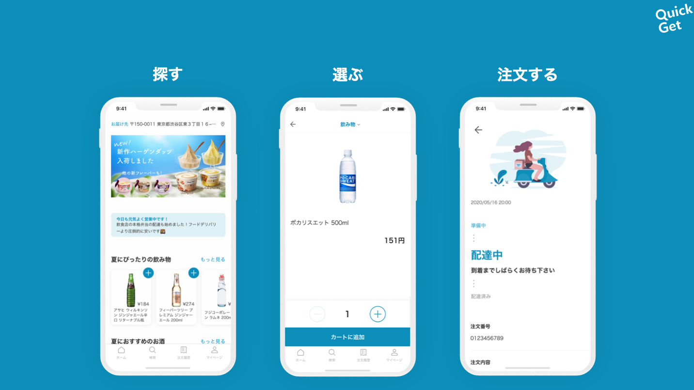 | 関連URL | 商品代+配送料250円、アプリ利用料は無AppStore (iOS) https://apps.apple.com/jp/app/quickget/id1459529888 GooglePlay (Android) https://play.google.com/store/apps/details?id=jp.quickget.consumer.android Web https://quickget.jp/ ※Safari / Chromeを推奨、PCからは利用不可です |
