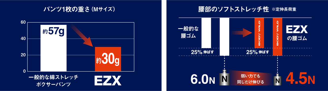 「EZX」の新しいウエストゴムは、多彩なカラーリングやこだわりのジャカード表現も可能に。着用感の高さだけでなくデザインも自由自在。