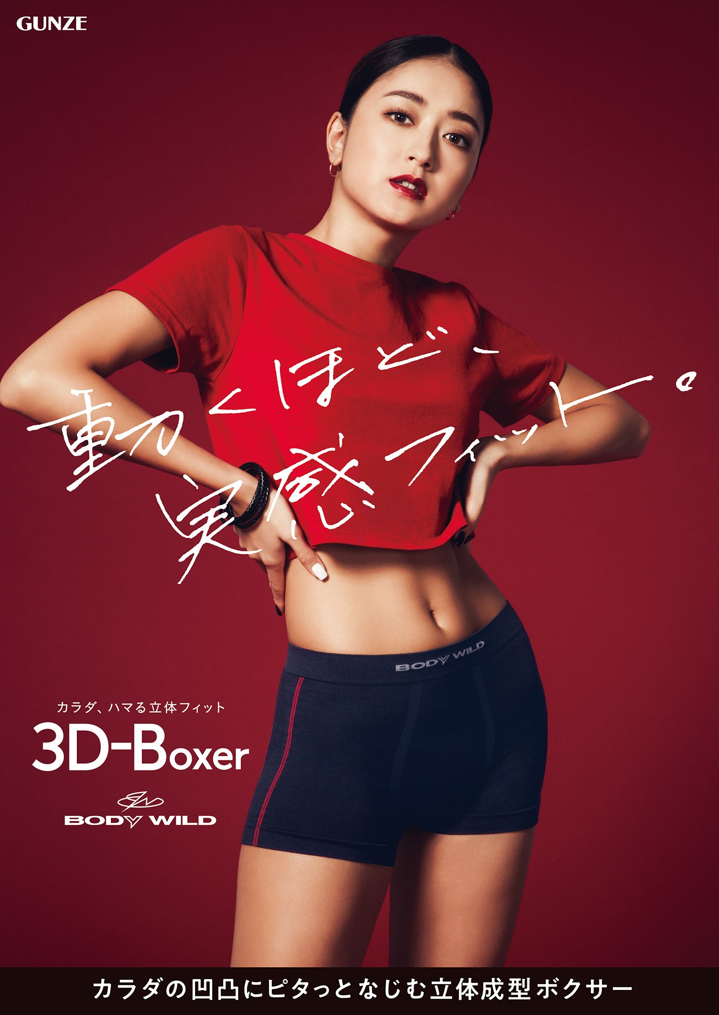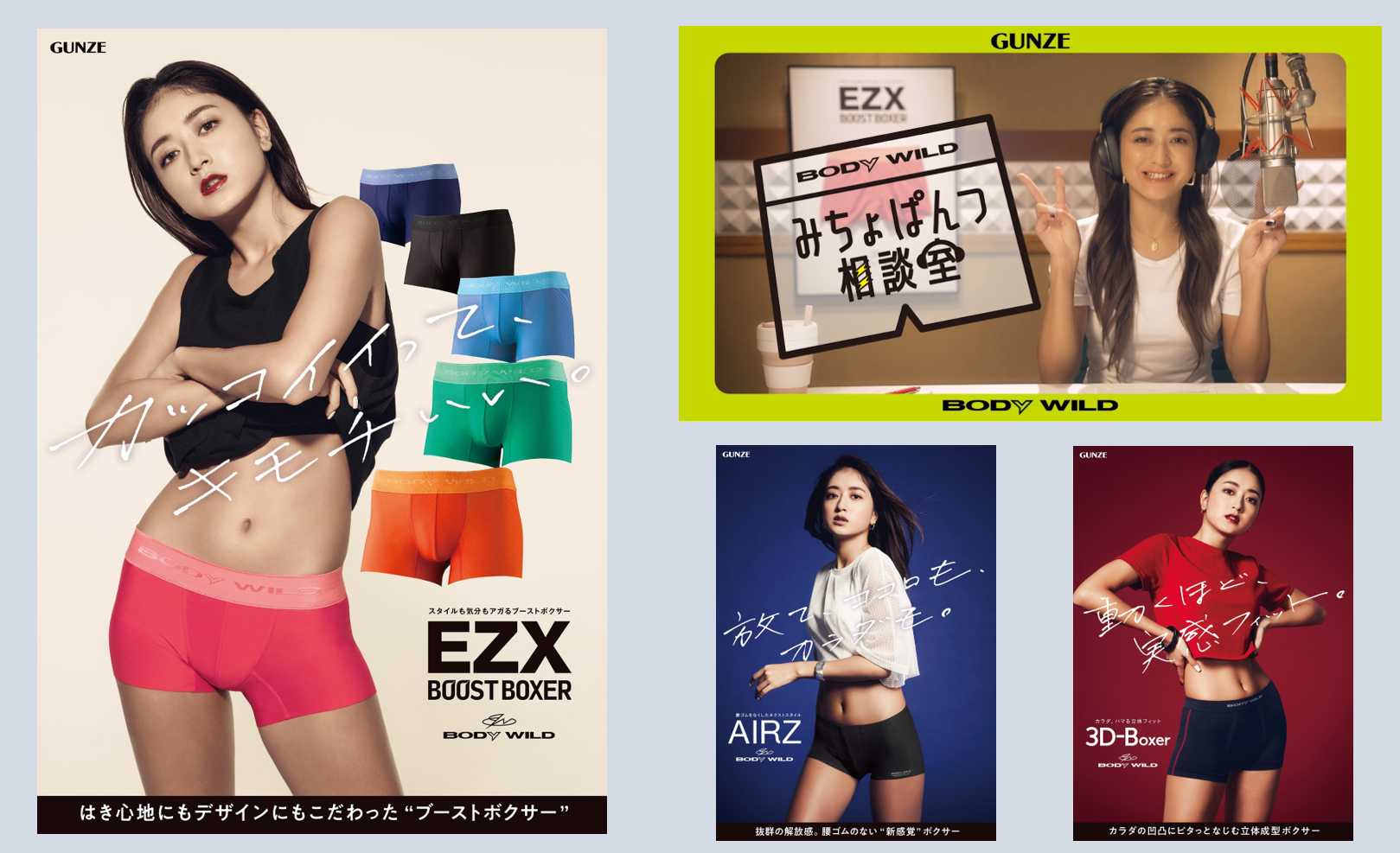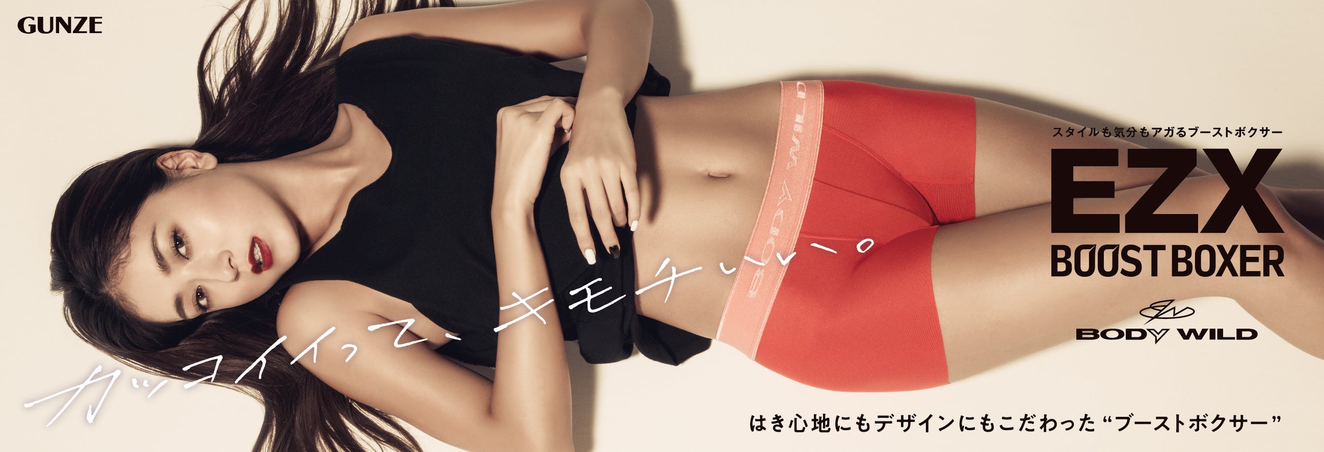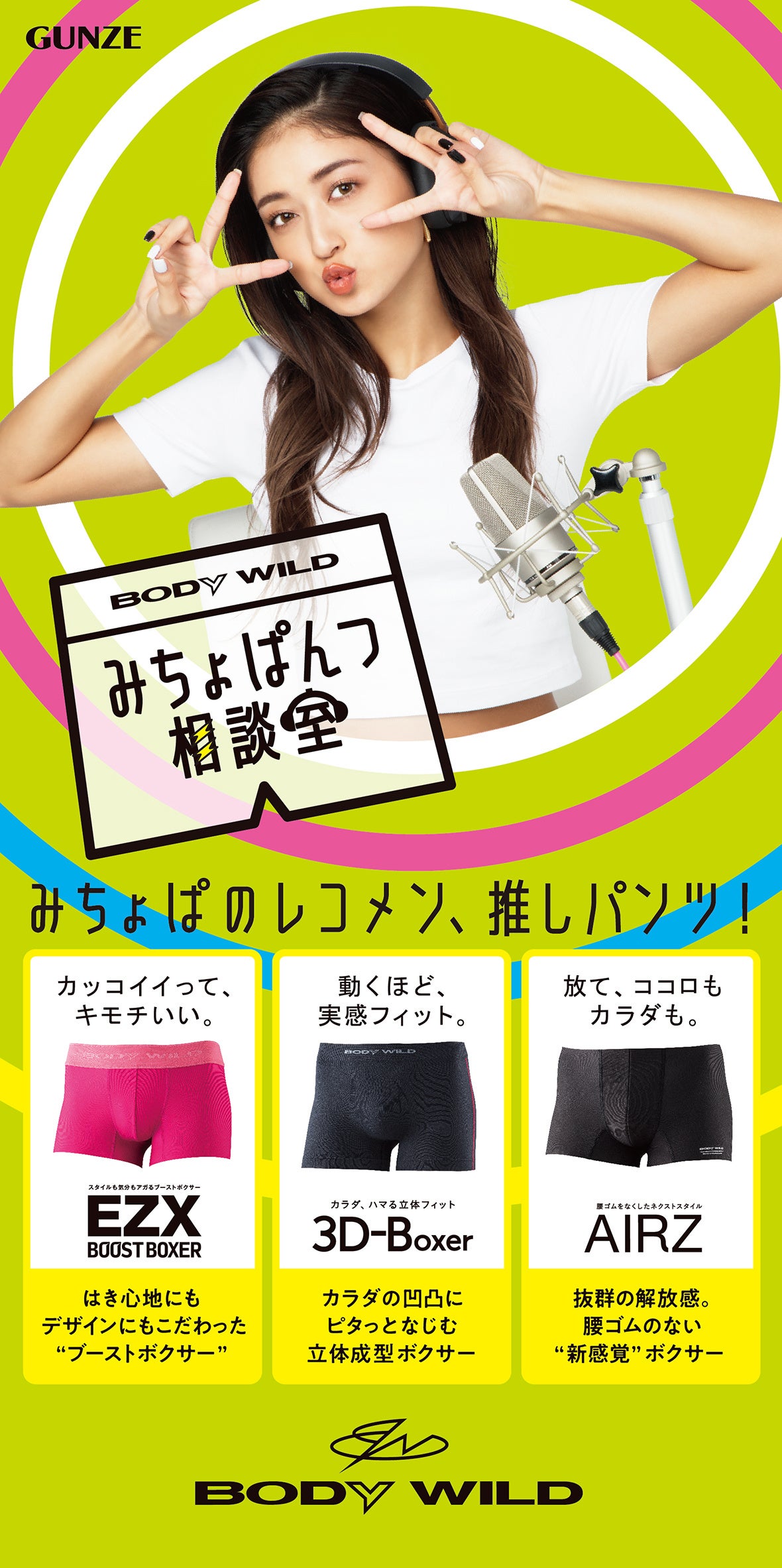 グンゼ株式会社(本社:大阪市北区、社長:佐口 敏康)は、イメージキャラクターを務める“みちょぱ”こと池田美優さんによるメンズインナーウェアブランド「BODY WILD(ボディワイルド)」の新ビジュアルを1月21日(金)に公開します。新ビジュアルは、カッコよさと気持ちよさをどちらもブーストした全く新しいボクサーパンツ「EZX(イージーエックス)」、絶妙なフィット感で快適な着用感を実現した「3D-Boxer(スリーディーボクサー)」、ウエストゴムをなくした新感覚の次世代アンダーウェア「AIRZ(エアーズ)」の3グループで、みちょぱさんがクールな表情で美ボディを披露。人気シリーズ「EZX」では今回新たに登場したローライズタイプをかっこよくはきこなしています。さらに、みちょぱさんがラジオDJ風にパンツのお悩みを解決する新WEB動画「みちょぱんつ相談室」も合わせて公開します。