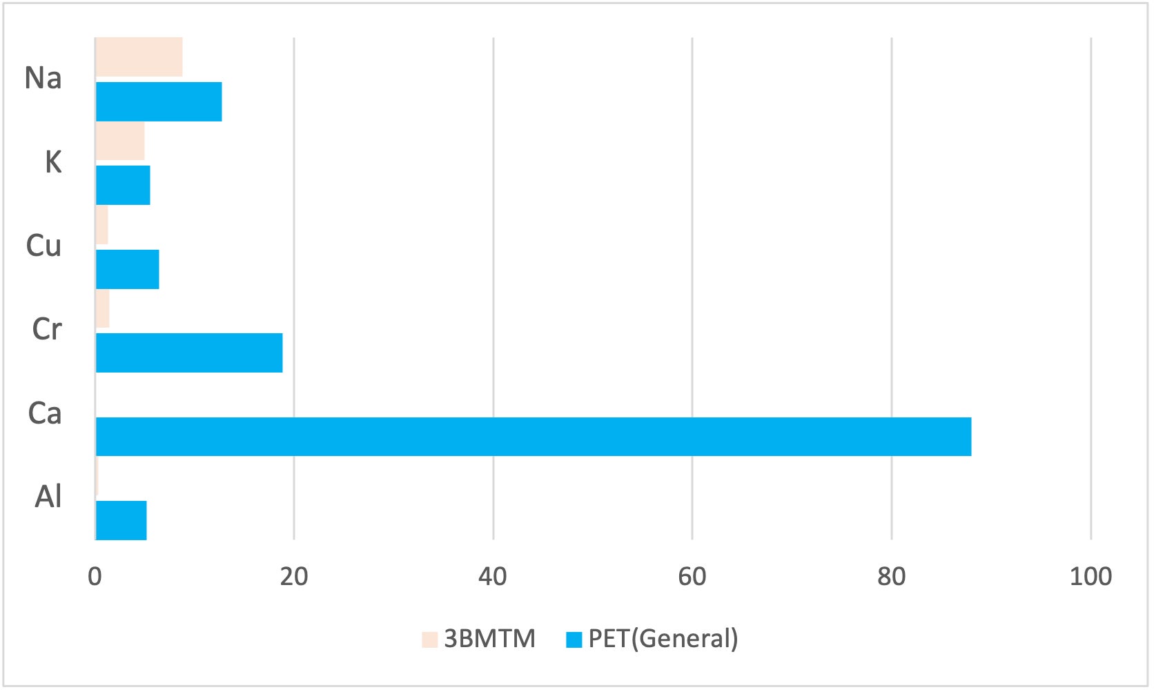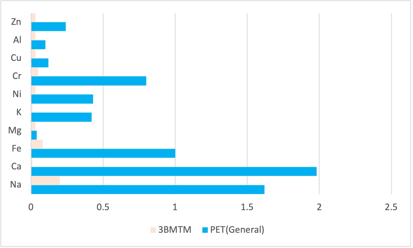 1)3BM®と一般的なPET製品との金属含有量の比較