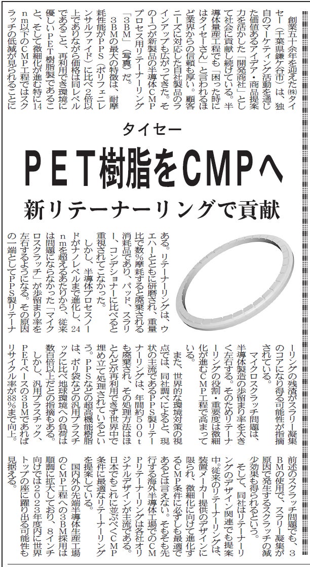 半導体CMP装置に特化したPET系材料、3BM® で開発したリーテーナーリングとその材料の販売を開始しました。環境負荷の低減と生産性の向上及び、コスト削減に貢献します。