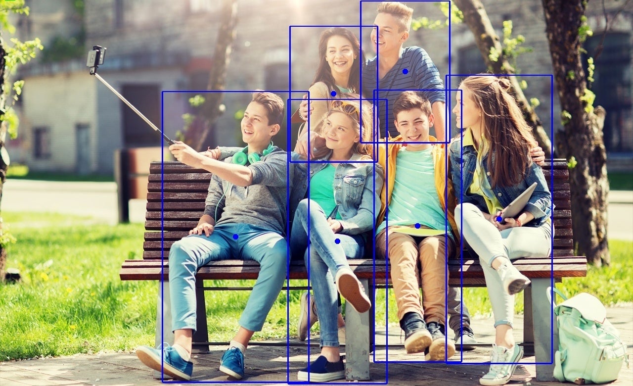 上半身のみしか映っていない人体、重なり合った人体でも正確に個別に判定しています。