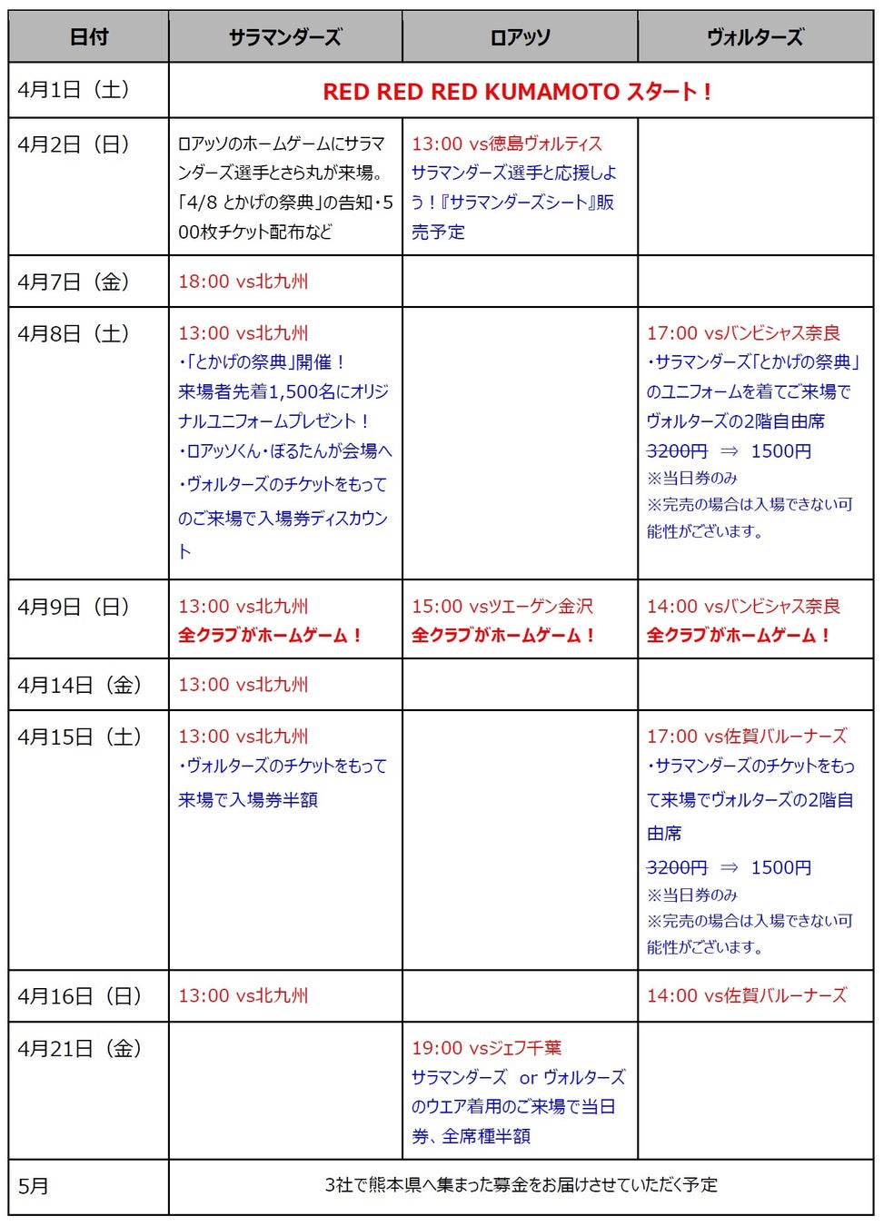 『RED RED RED KUMAMOTO』が発足!4月の熊本を熊本ヴォルターズ、ロアッソ熊本、火の国サラマンダーズのプロ3クラブが盛り上げる!