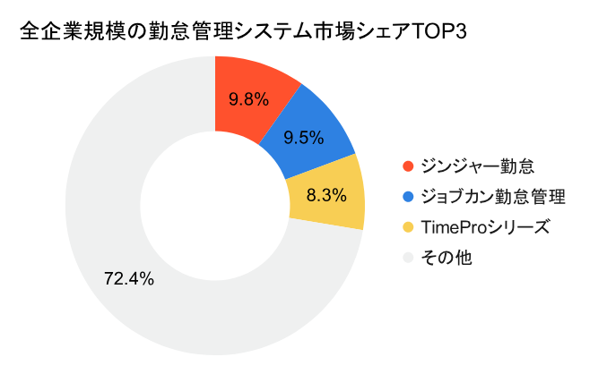 勤怠管理システムののうち、最も利用されている製品の上位3製品は、ジンジャー勤怠(9.8%)ジョブカン勤怠管理(9.5%)、TimeProシリーズ(8.3%)でした。