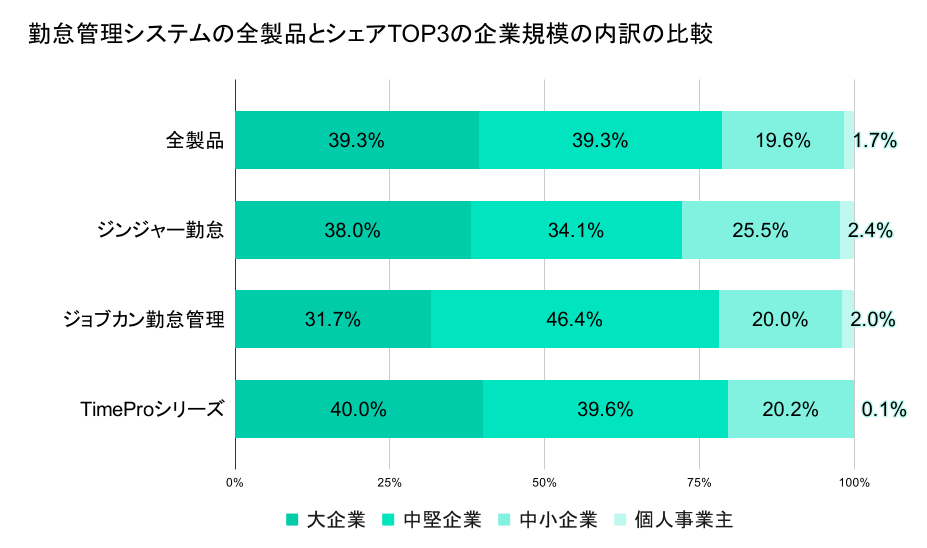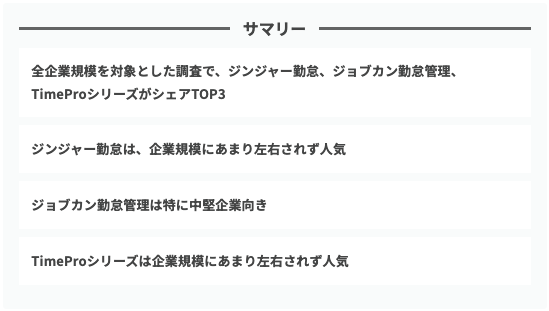 前述の上位3製品は、企業規模問わず上位をキープする傾向でした。ジンジャー勤怠およびジョブカン勤怠管理は、他のバックオフィス業務のソフトを提供しているシリーズ製品という共通点もあり、企業ごとのニーズに合わせて、運営会社が同じソフトで固めることができる点なども評価されていると考えられます。一方、Time Proシリーズは事業規模ごとにシリーズが別れており、事業規模に応じたニーズに対応できる点が評価されている事が考えられます。