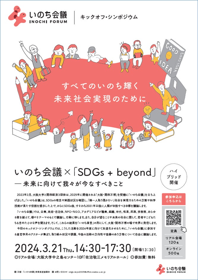 大阪大学は、3月21日(木)に大阪大学中之島センターとオンラインにて、大阪・関西万博に向けて、シンポジウム「いのち会議 ×『SDGs +beyond』-未来に向けて我々が今なすべきこと-」を開催します。