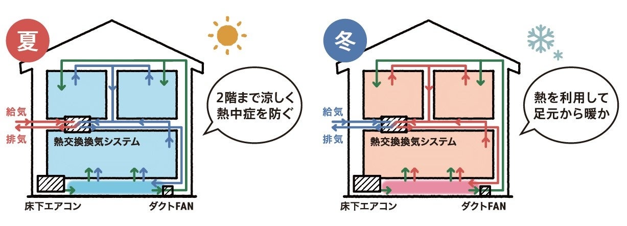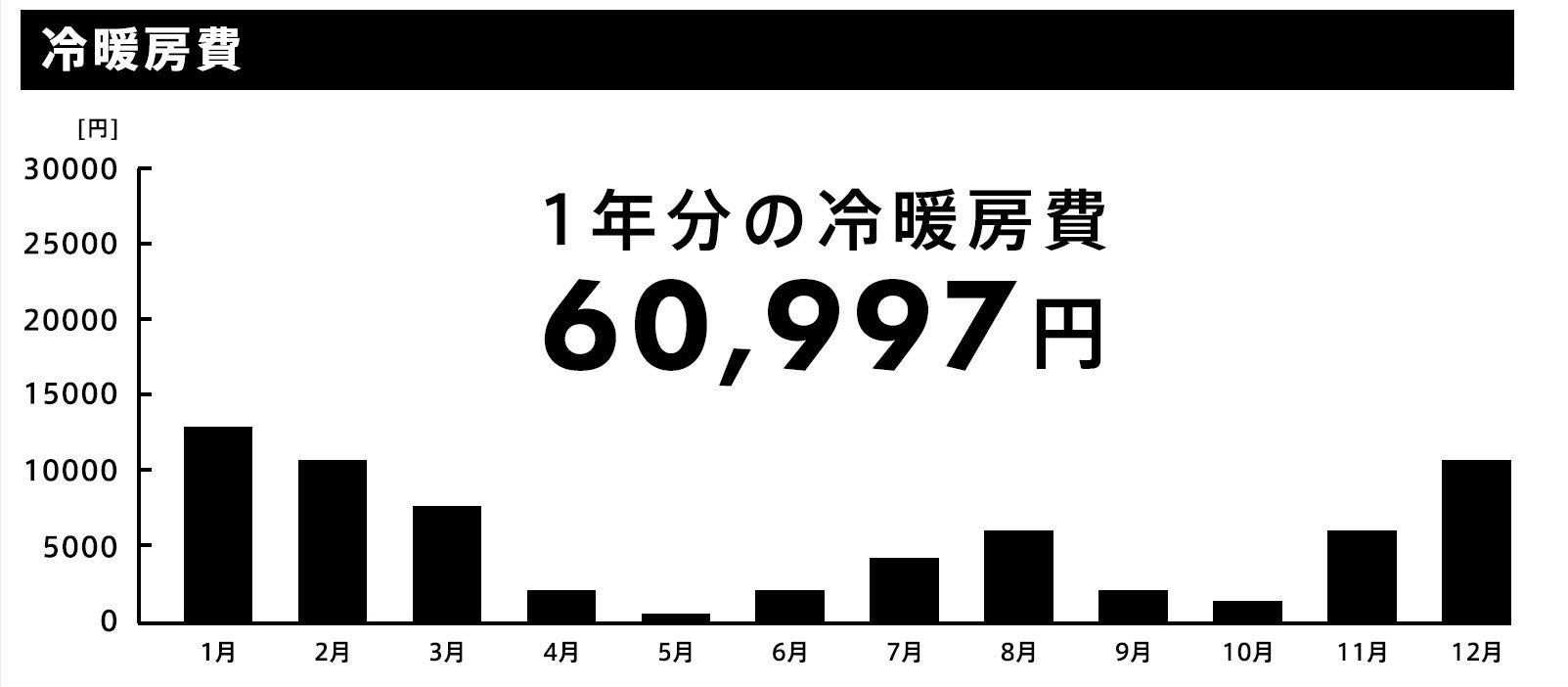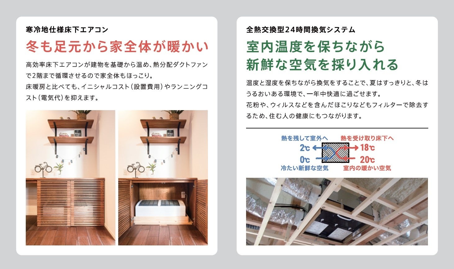 モデルハウスには、実際に人は生活していませんが、床下エアコンが24時間常に稼働している状態で、寒さが一番厳しい1月の暖房費は、13,336円になりました。こちらにIHやエコキュートなどの生活家電費をプラスすると、約22,000円前後の電気代になると予想されます。大事なのは「エアコン1台」でこの電気代ということです。もし、全館空調にせず2階にもエアコンを設置し稼働を行うと、さらに電気代が上がってくることが予想されます。床下エアコンと全熱交換型24時間換気システムで建物全体を暖めたことは、とても効率的な暖房方法だったといえるでしょう。