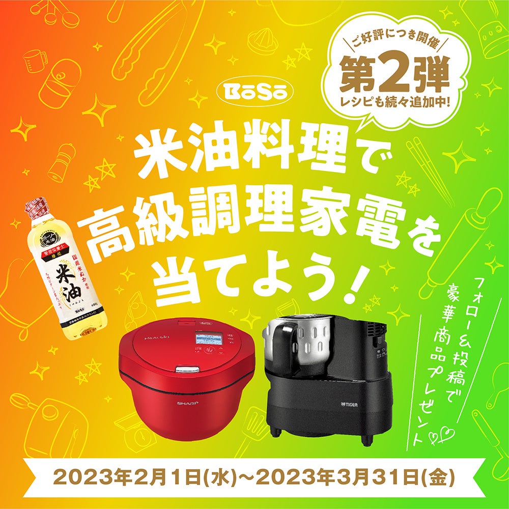 ボーソー油脂株式会社(本社:東京都中央区、代表取締役社長 金子俊之)は、2023年2月1日(水)より当公式インスタグラムアカウントにて、「フォロー&投稿で豪華賞品プレゼントキャンペーン」を実施いたします。本キャンペーンは、昨年実施し大好評につき第2弾を開催することとなりました。本キャンペーンを通じて、米油を使ったことのない方には米油の良さを知ってもらう機会に、使ったことのある方には更なる発見の機会になるとうれしいです。