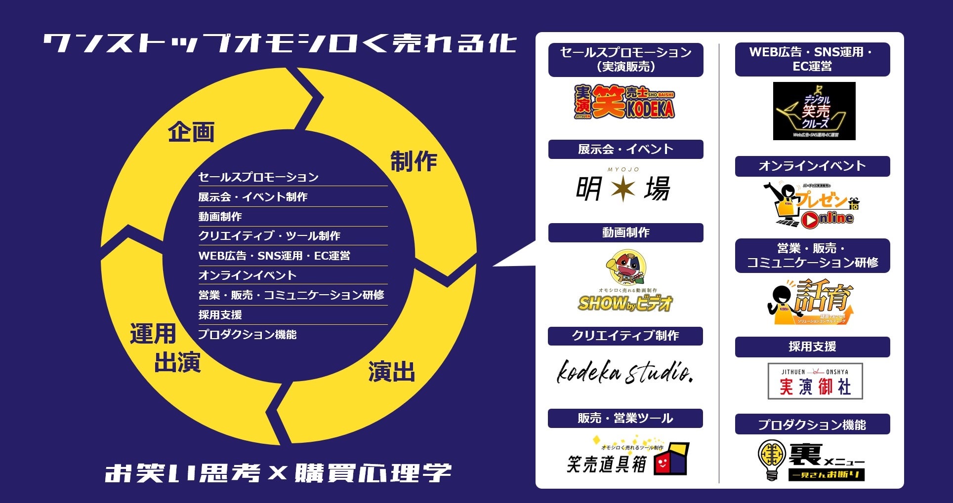 お笑い思考×購買心理学でおこなうオモシロく売れる化の専門会社。ソリューション領域はセールスプロモーション(実演販売)、展示会・イベント制作、動画制作、クリエイティブ制作、販促グッズ制作、WEB制作、WEB広告・SNS運用・EC運営、オンラインイベント、営業・販売・コミュニケーション研修、採用支援、プロダクション機能の9領域。社長以下全社員がお笑い芸人か元お笑い芸人であり、お笑い思考マーケティングと購買心理学のプロとして、結果を出すことに留まらず、お客様に笑いを届けられることが最大の強み。