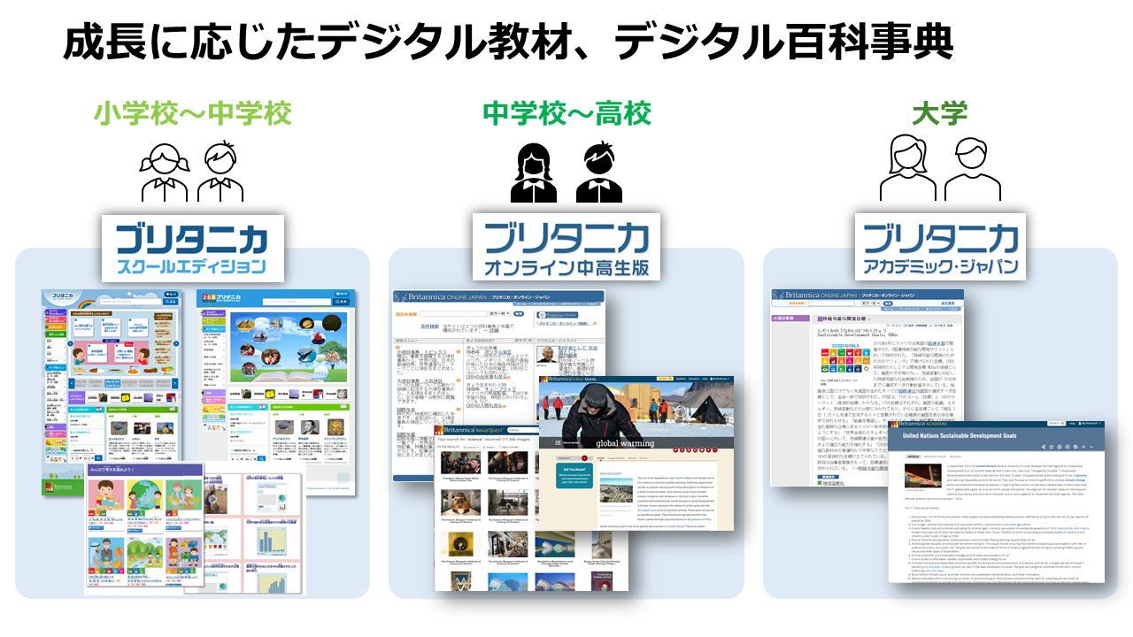 シカゴに本社を置く、グローバル企業として250年の歴史を持つブリタニカは、百科事典やデジタル教材を制作・提供するプロバイダーです。多彩なコンテンツ(1000カテゴリー・13万7000項目)を強みに、「信頼・安心・安全・発展」を掲げ、幼稚園から大学を含む教育機関で高く評価されてきました。今後も幅広い教育向けコンテンツや、教科横断学習用コンテンツを提供してまいります。